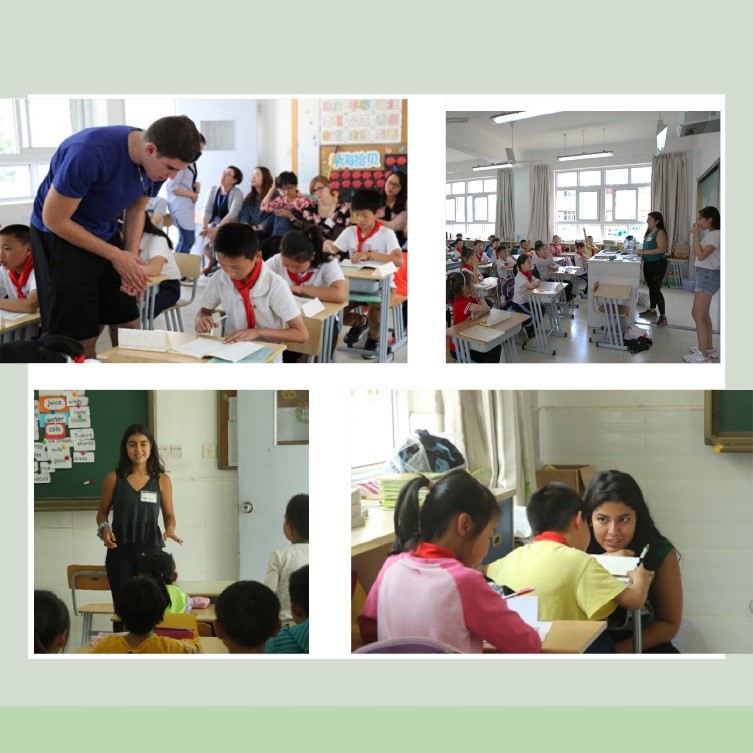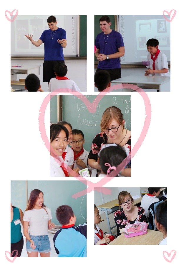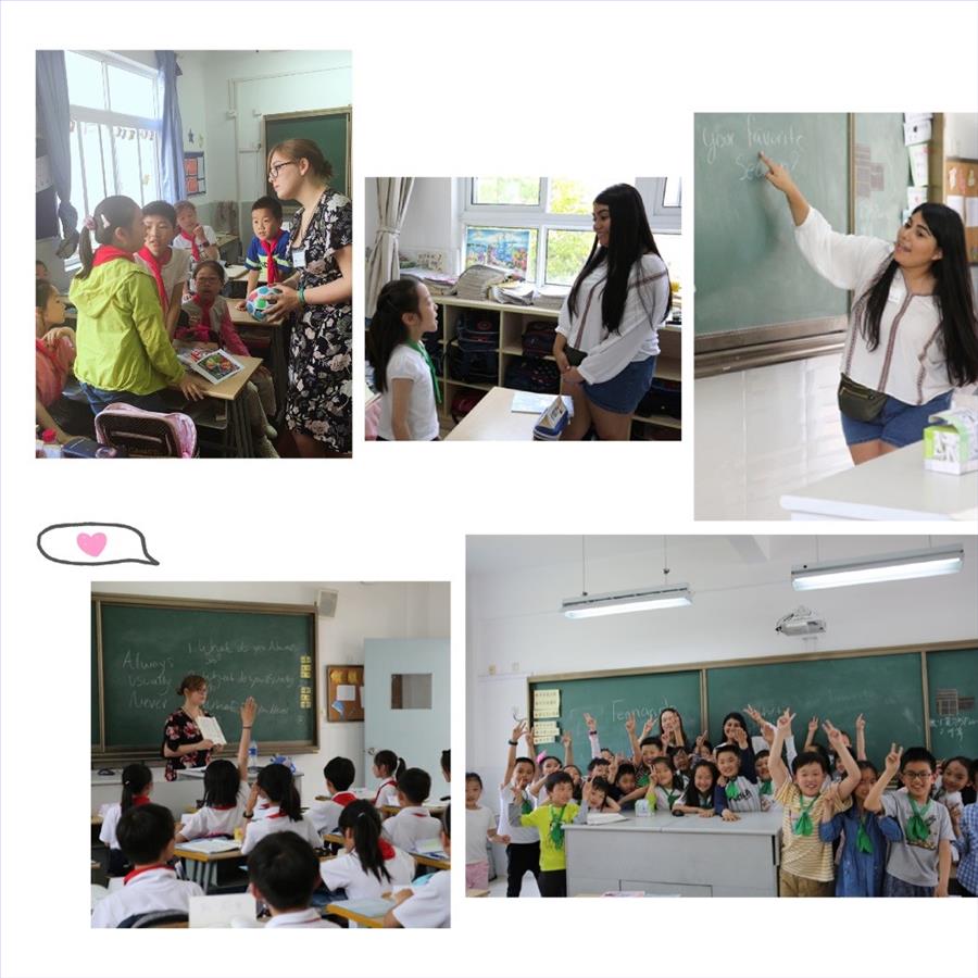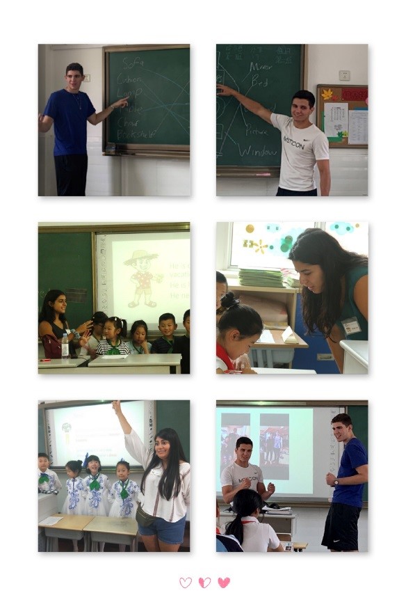 Olivia是个可爱的姑娘,上起课来却是很有条理,用甜美的笑容俘获一年级的孩子们!Fernanda真是个天生的教师,从容大气,每当学生说正确,总是热情洋溢地表扬:“Good job……”可爱的音调几乎给全场洗脑,忍不住赞叹Good job! Victoria和Ariadna是一对好搭档,他们一起合作为三年级学生带来游戏与基础操练相结合的课堂。Victoria每次介绍自己的中文名谭思敏都很认真,然而!说的是唐思绵(?):)Ariadna让大家叫她Ari,简直太顺口了!她总能认真倾听,还职业控场!Ethan和Jake这两个运动健将也是强强联合,和五年级学生打成一片。Ethan可是篮球队的,身高两米,进教室都担心他会不会撞到门框……他爱和孩子们击掌,每节课都要一个个人拍过去。Jake是皮划艇、骑马都拿手,跟Ethan组成最萌身高差,这对组合拿着苍蝇拍在五年级所向披靡,无一次赢过学生。