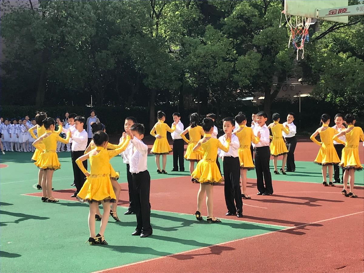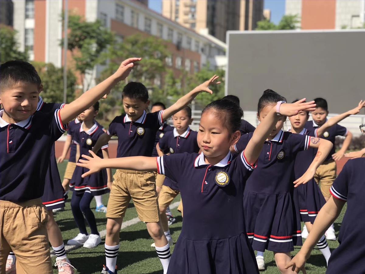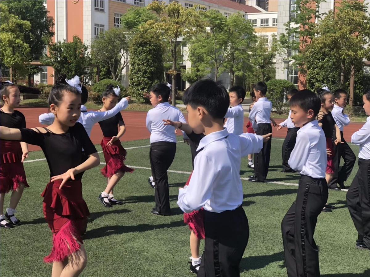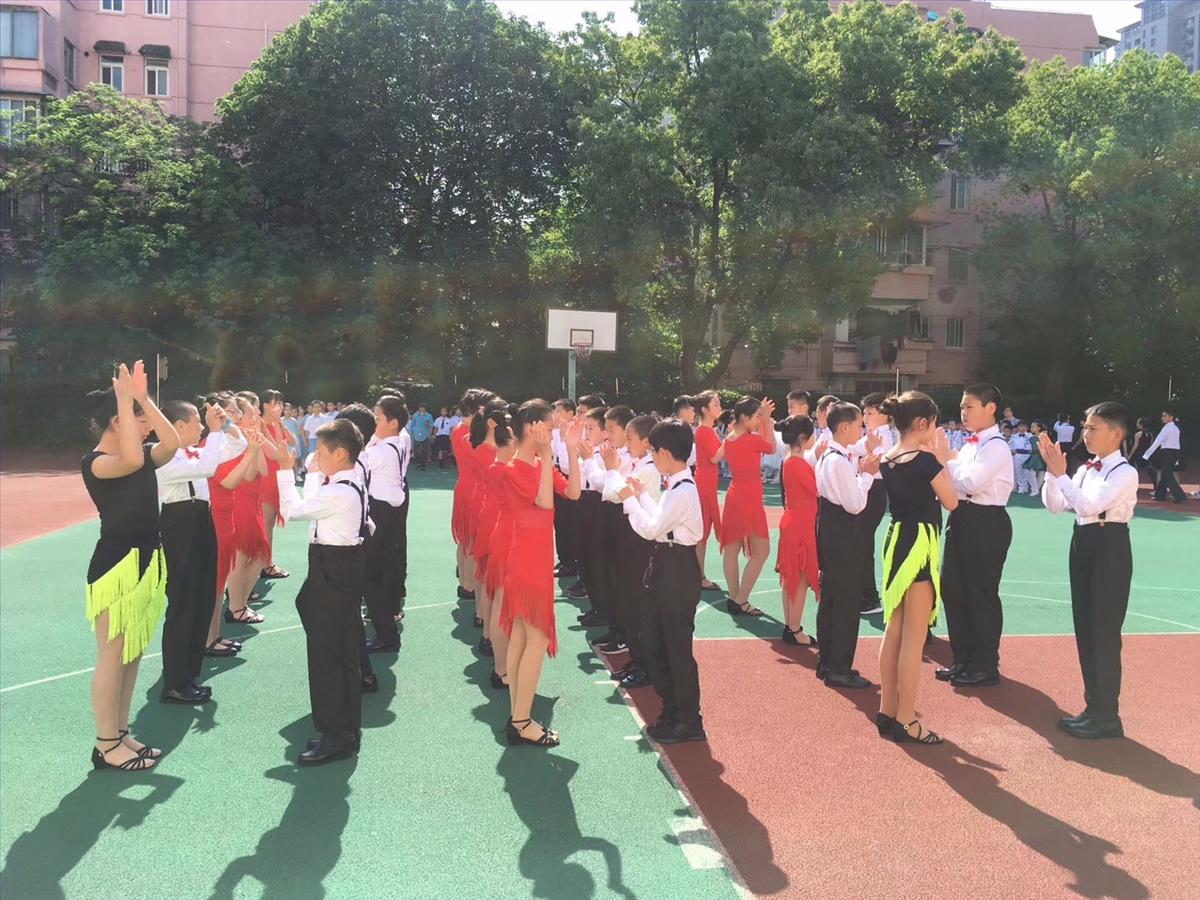 集体舞动作元素以体育舞蹈“恰恰”为主,恰恰舞是一种灵动性强的体育舞蹈。本届集体舞创编过程中,音乐组老师既融合了体育舞蹈的热情奔放,又根据小学生年龄特点加入了活泼俏皮的辅助动作。