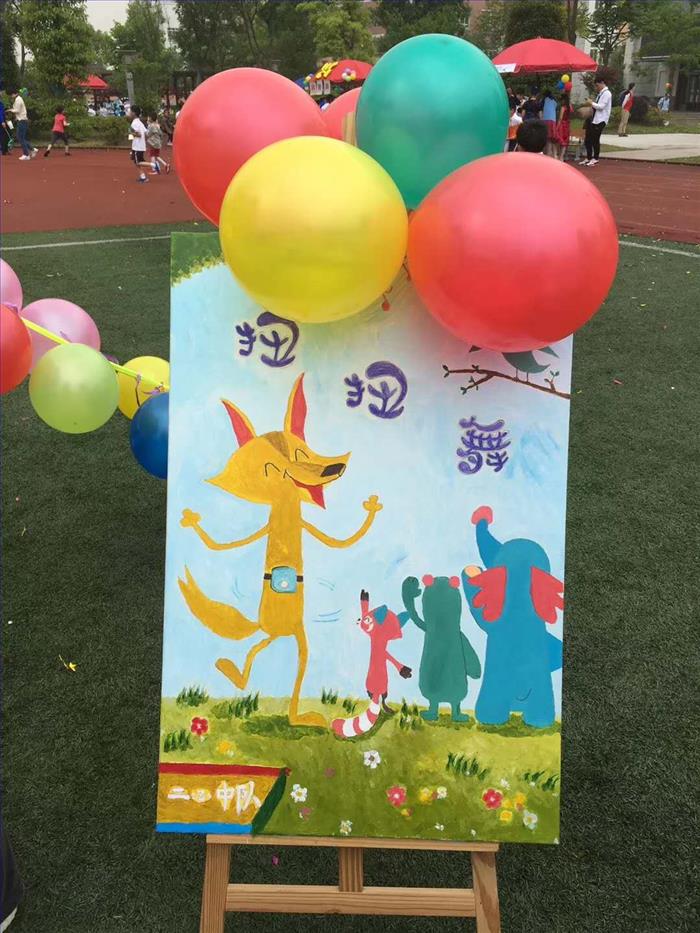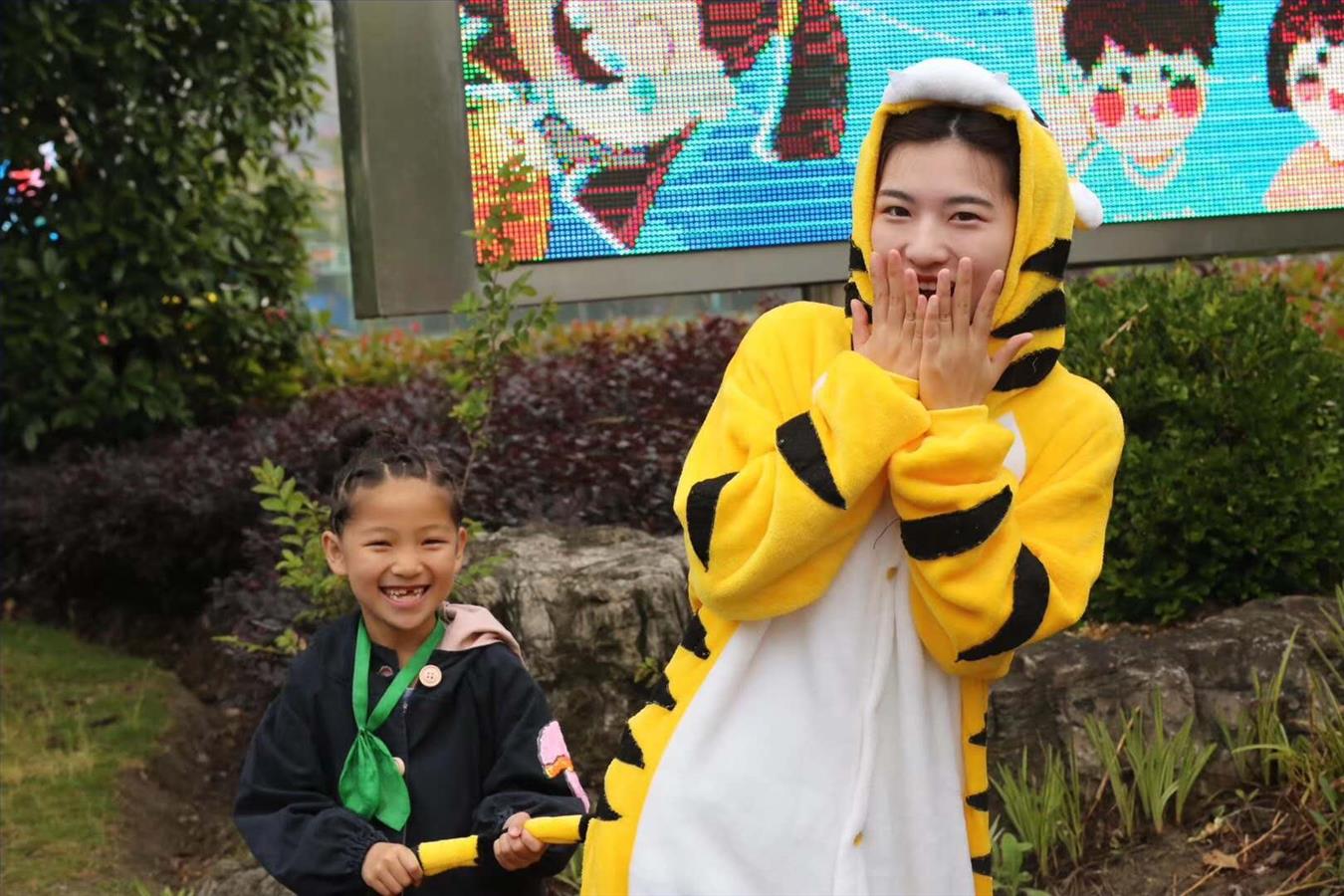 懿德校区——离正门不远处摆放的是用彩色气球扎成的“节日拱门”,两侧站立着好多位身着卡通动物服的东方教师,他们形态可掬,惹人喜爱,招来了不少孩子与他们拍照留影;绕操场四周的每一棵上都挂着串串彩色气球,犹如成熟的蔬果丰收在望,煞是喜庆;主席台的三侧栏杆也被黄白红三色气球装点一新,渲染着隆重的节日气氛;面朝大操场的主席台电子大屏幕上色彩靓丽,显示着当日活动的主题——“第三届嘉年华闭幕展演·游园会”;校区内的学生们都在各自的教室里候场。