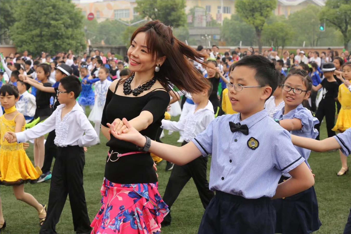 蓝村校区学生的华尔兹舞,懿德校区学生的啦啦操,是各自的优势和强项,各有各的味道。在小主持的开场白之后,拉开了两个校区学生校园舞蹈的展示秀。人人参与,别具一格,风采独特。教师代表、家长志愿者的加盟成为一道亮丽的风景。这里没有年龄之分,没有性别差异,没有身份隔阂。东方的校园成了舞者的用武之地,成了体育、美育、音律的融合场所,成了爱和欢乐的海洋。