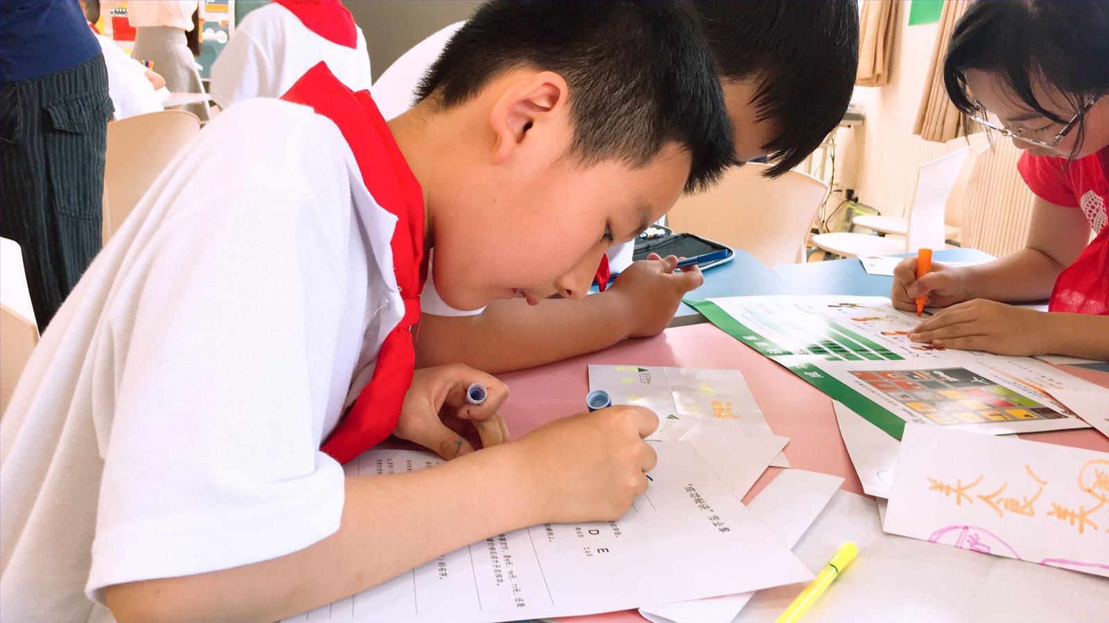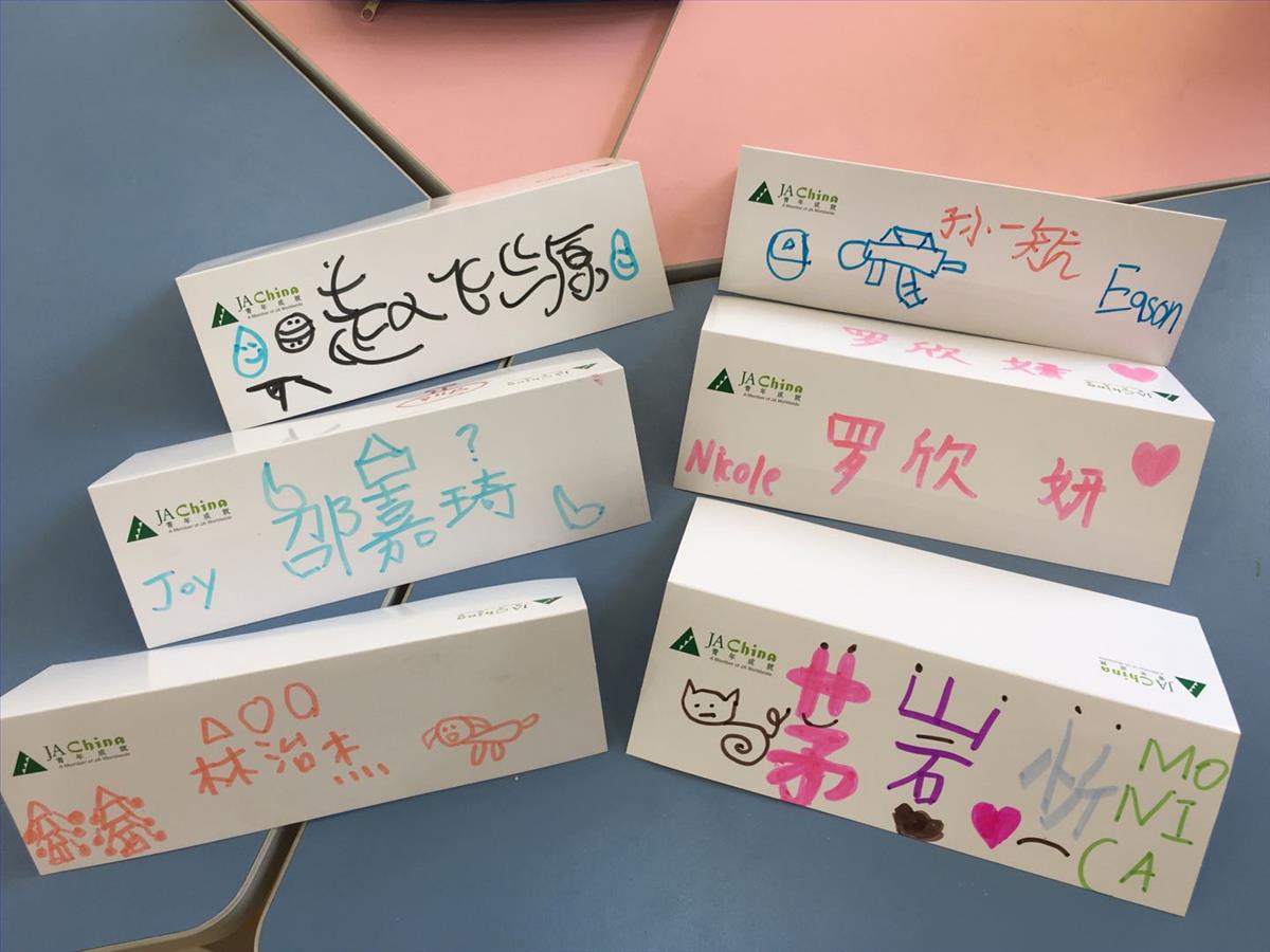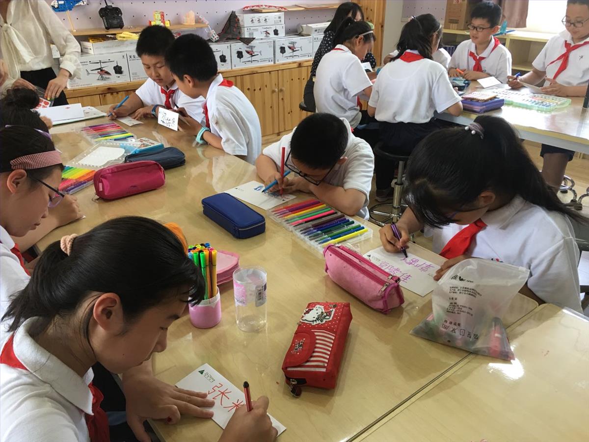 课程伊始,学生们就在志愿者老师的带领下为自己设计铭牌,大家发挥想象,大胆构思,用彩笔在纸上描绘出拥有自己特色的设计。3分钟后一张张别具一格的铭牌就应运而生了。