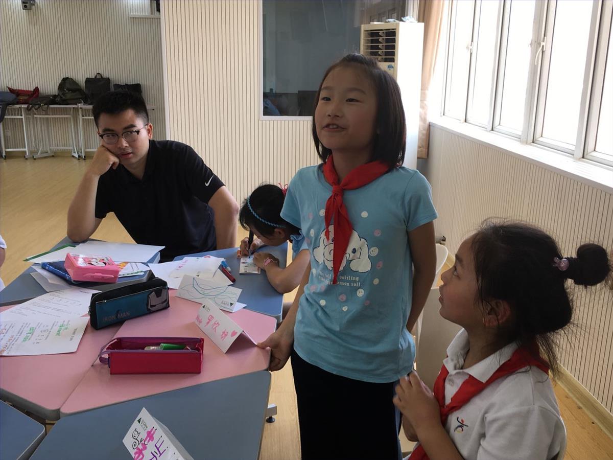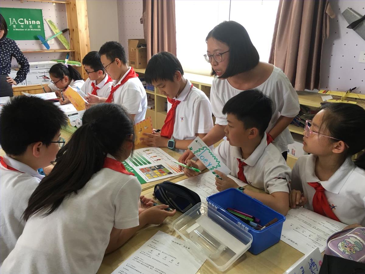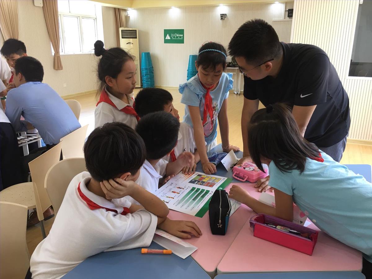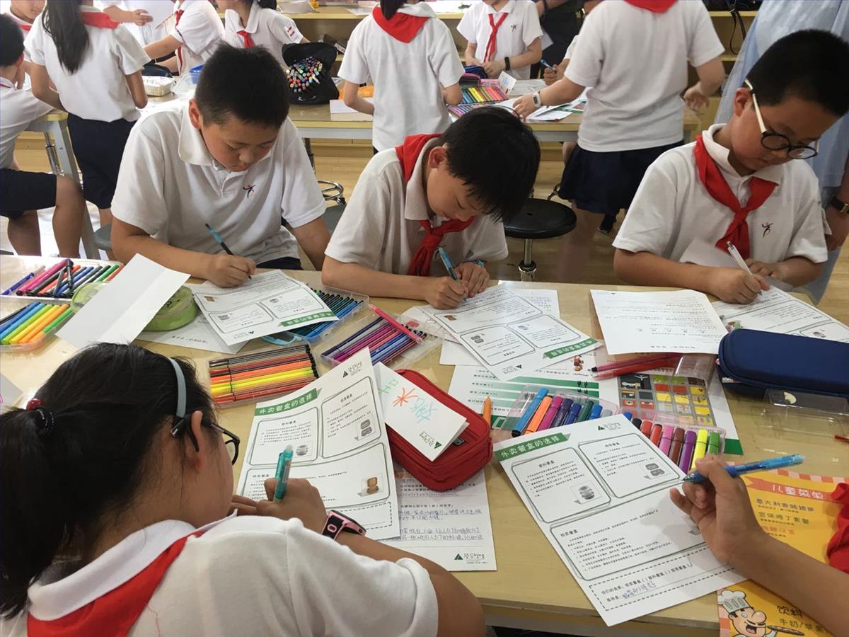 接着,学生们在志愿者老师的引导下慢慢地融入课程——大家像真正的餐馆老板一样去思考问题,从地点选择、成本分析、员工录用、产品消费、经营推广等角度入手,经过小组讨论、交流、协调、制定各类计划和方案,最终做出合理的决策;并且为餐馆的外卖服务选择合适的包装盒,同时还要为餐厨垃圾的处理提出合理操作的实施方案。