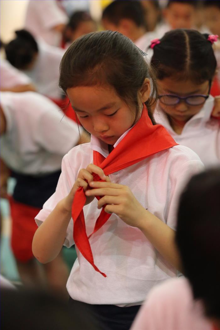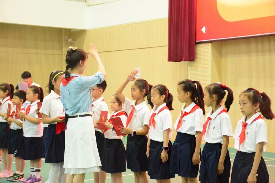 活动开始,大队辅导员汪轶灵老师带领新入队的队员们宣誓,队员们用洪亮的嗓音庄严宣誓: “准备着——为共产主义事业贡献力量……”队员们个个神情专注,鲜艳的红领巾映衬着一张张绽放出灿烂笑容的脸庞。接着,二年级年级主管王雁老师为新队员代表颁发少先队员证,孩子们脸上洋溢着喜悦之情。之后,新队员代表进行发言,表示他们会更努力,做好接班人,为学校和班级争光,用实际行动证明自己无愧于“少先队员”这个神圣的称号。最后,张华副校长热情地激励新队员们能怀着一颗火热的心,认真学习,不畏艰难,敢于有梦、勇于追梦、勤于圆梦,争做优秀好队员,为伟大的祖国贡献智慧和力量!