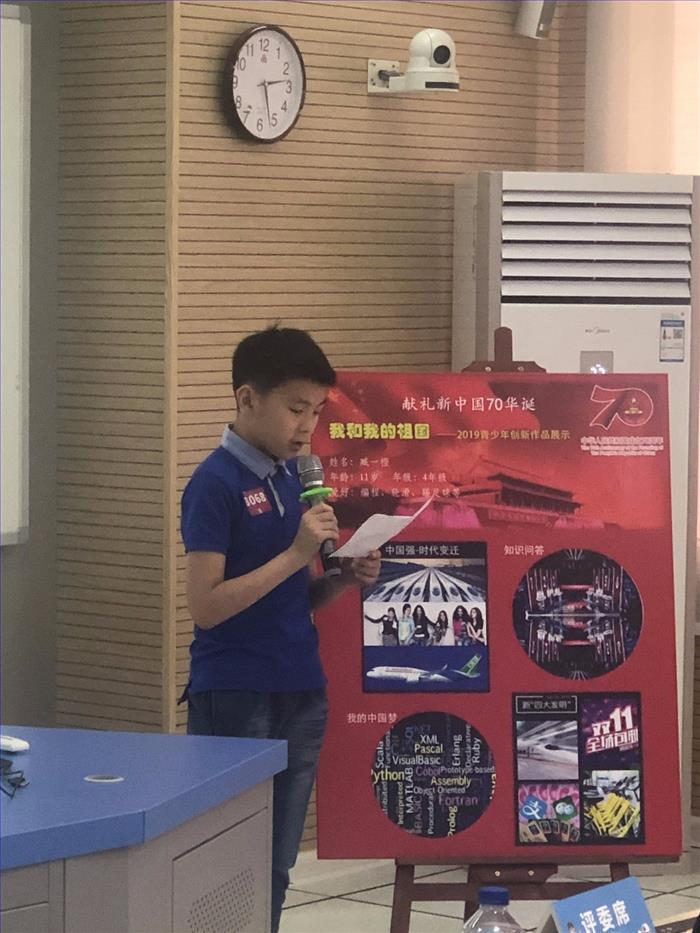 2019年6月9日,“献礼新中国70华诞”——“我和我的祖国”2019年青少年创新能力展示活动线下总展示在浦东新区浦师附小举行。本次活动由上海市文明办未成年人工作协调处、上海市妇联宣传与网络工作部、上海市校外教育协会携手上海市校外教育群文中心教研组、浦东新区青少年活动中心共同举办,活动得到昂立STEM、上海校外宝教育科技股份有限公司的大力支持。本次活动从4月启动以来,征集到千余个线上编程作品。东方小学入围的四名同学都以不同的方式进行了作品的介绍和演示。个人演讲需要在4分钟内完成。
