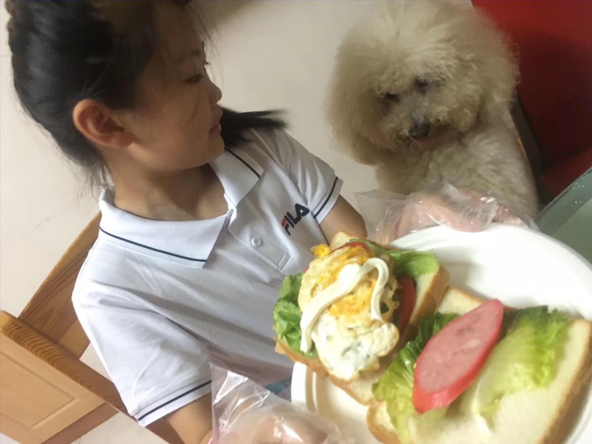 随后,大家来到倪老师家,自制三明治当午餐。小伙伴们相互帮忙,各人自由创意搭配,还有可爱的狗狗多多在一旁呆萌地“监工”,吃着自己的劳动成果,心里倍爽。