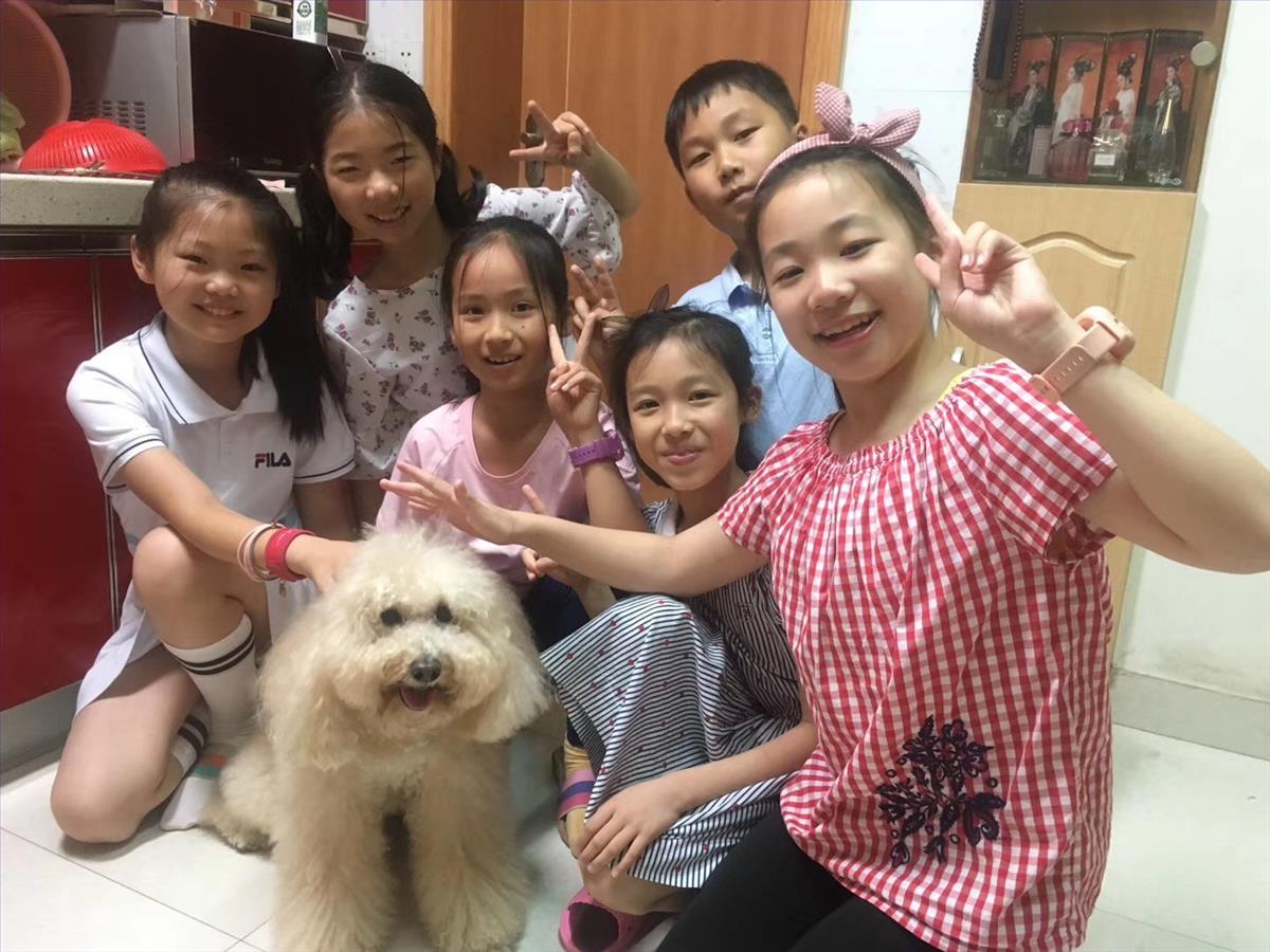 接着,狗狗多多像小明星似地和大家互动,乖乖地趴在地上,有人和它握握手,再摸摸它毛茸茸的脑袋,好可爱哦!最后,多多还和大家一起合影留念,尽显乖巧的“主人”风采。