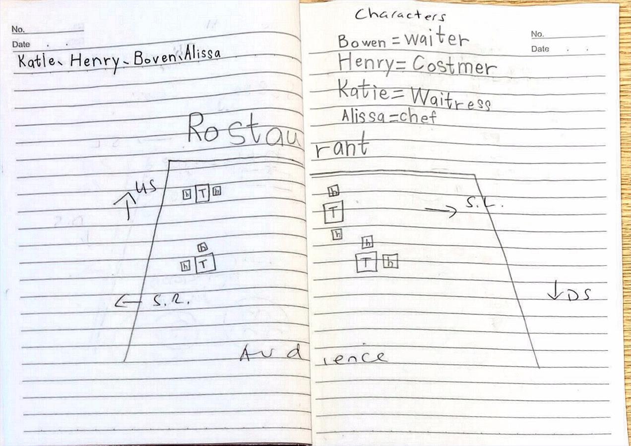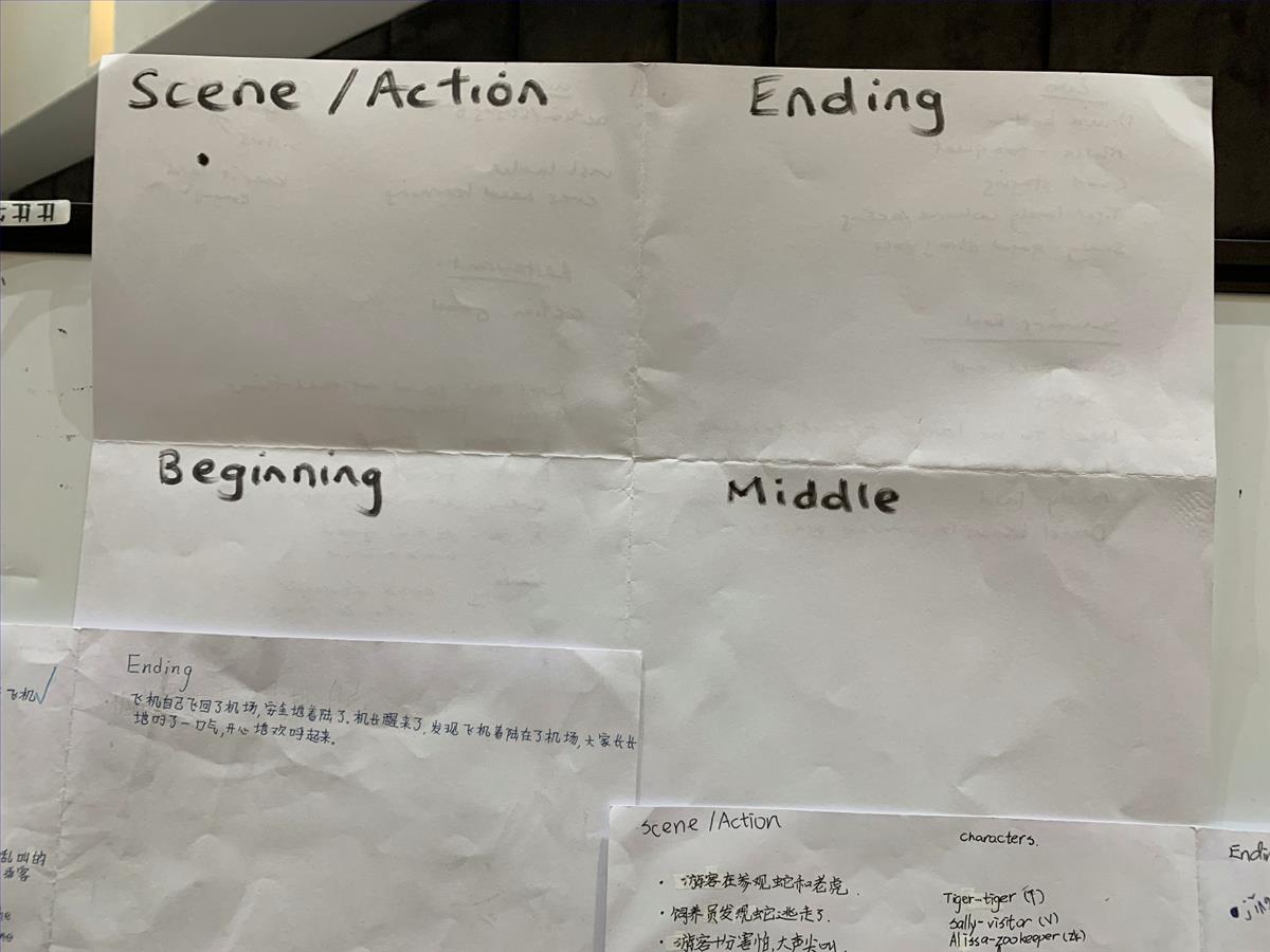 本次培训的最后一天是观察Kerry的课堂教学,从学生的表现可以追溯到老师的教学痕迹。在Devise Drama的教学中,Kerry老师并不急于让学生编写文本,而是请学生思考场景,并设定短剧的开始部分和结尾部分,中间部分则是最为复杂的,因此最后再思考和编写中间部分。这个顺序很有意思,尤其是对中间部分的思考会让学生觉得十分挑战,让前因后果都符合逻辑则更是有难度。但是Kerry老师经验很丰富,她不但组织起了四个年龄跨度从一年级到六年级的学生组合,更是指导了四个不同主题的剧本创编和演绎,她将大量的精力都投入到了自己的教学中,一丝不苟,唯有敬业。