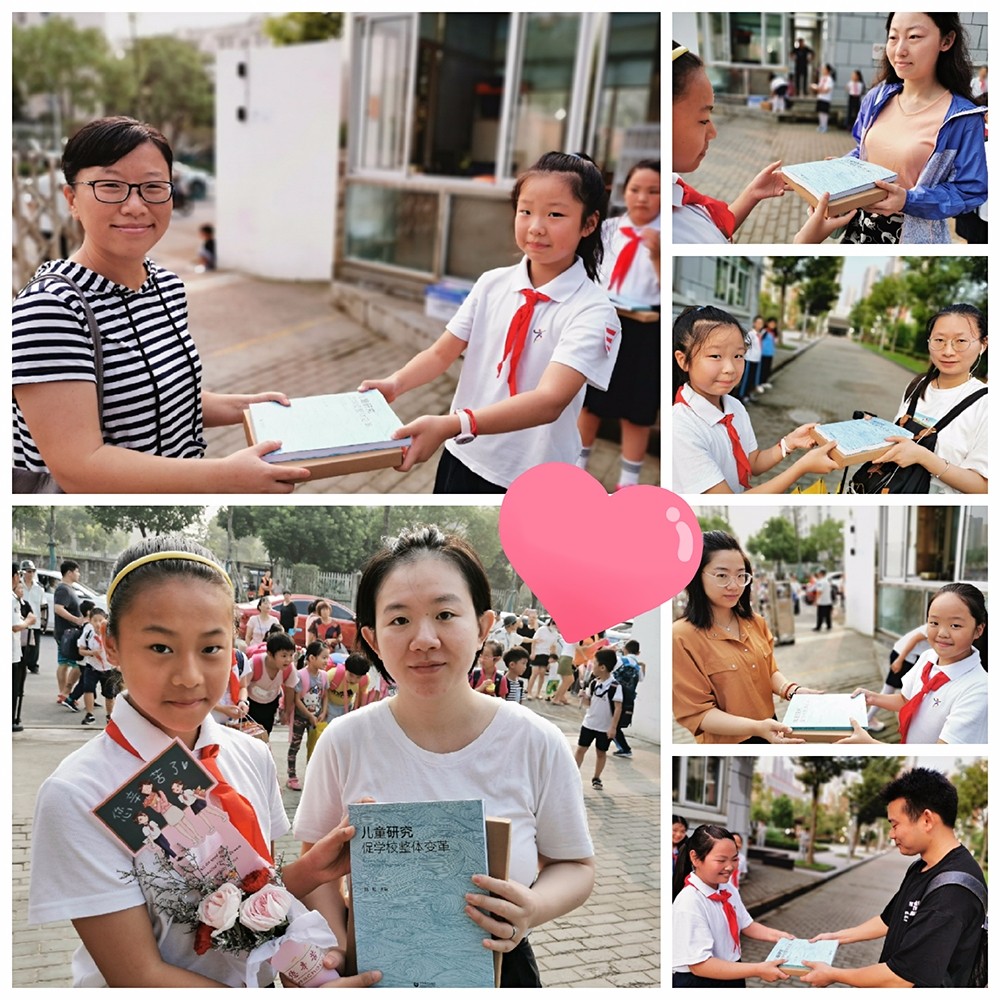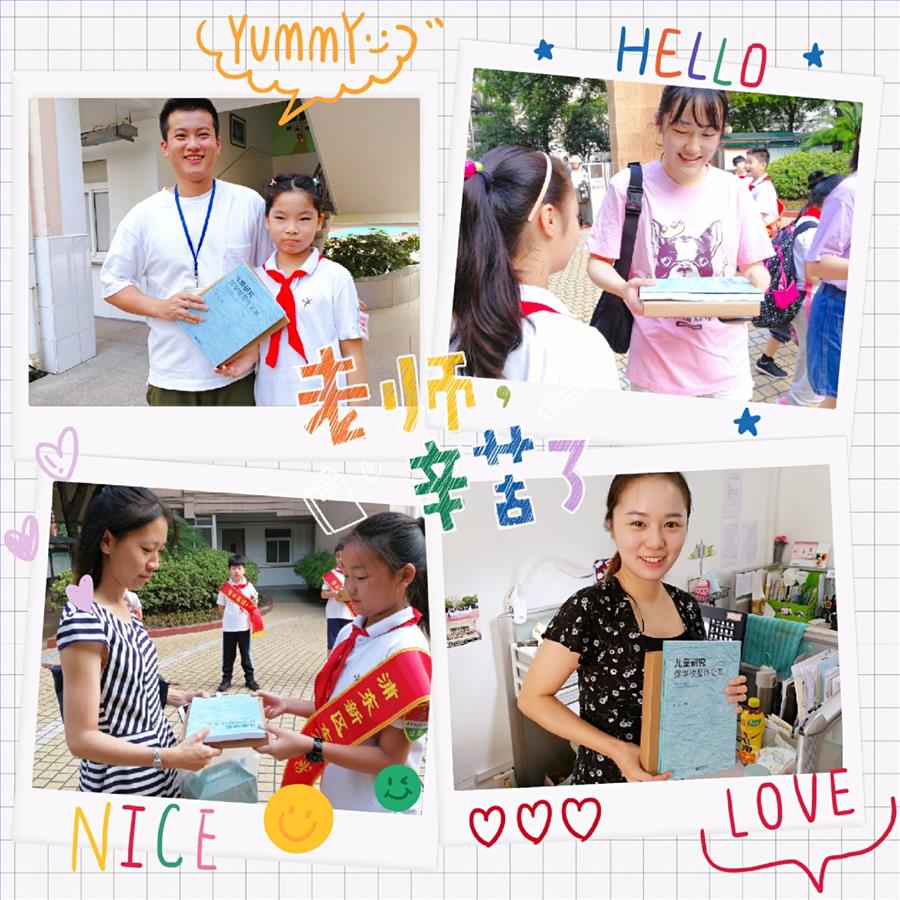 不一会儿,校门口陆陆续续走进了几位老师,红领巾们一拥而上将老师们团团围住,用甜美的声音齐声喊出出对老师最真切的祝福:“老师,祝您教师节快乐!”哦!原来他们一直等候在门口是要给每个老师道一个感谢,送一份祝福——红领巾们每人手里捧着的还有学校在每年这个特别的日子送给老师们的一份小心意,这也是东方大队部的传统。每年教师节给老师送一份小礼物,给一个小惊喜,往年的有一盒润喉糖,几支红笔等,今年则是一本能将教学点滴心得记录在内的精致笔记本!