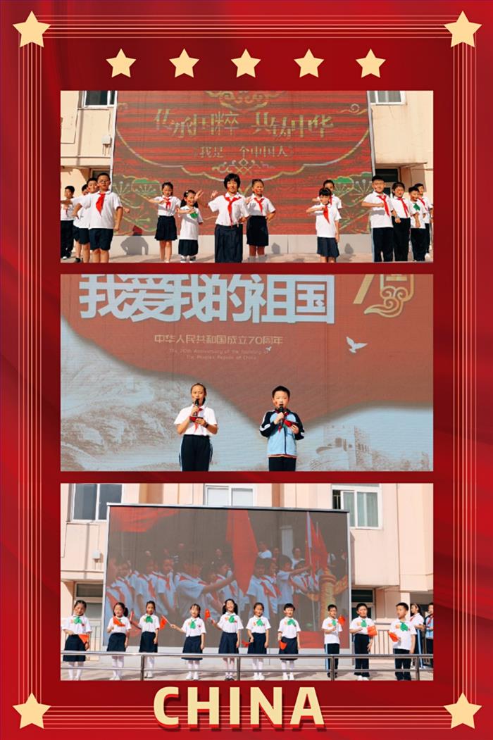 最后,来自二(3)中队的小百灵们用表演唱《我和我的祖国》向祖国献礼,赢得了在场师生们的阵阵掌声。