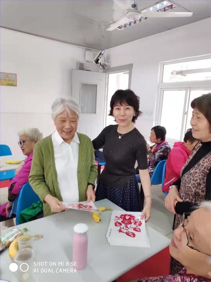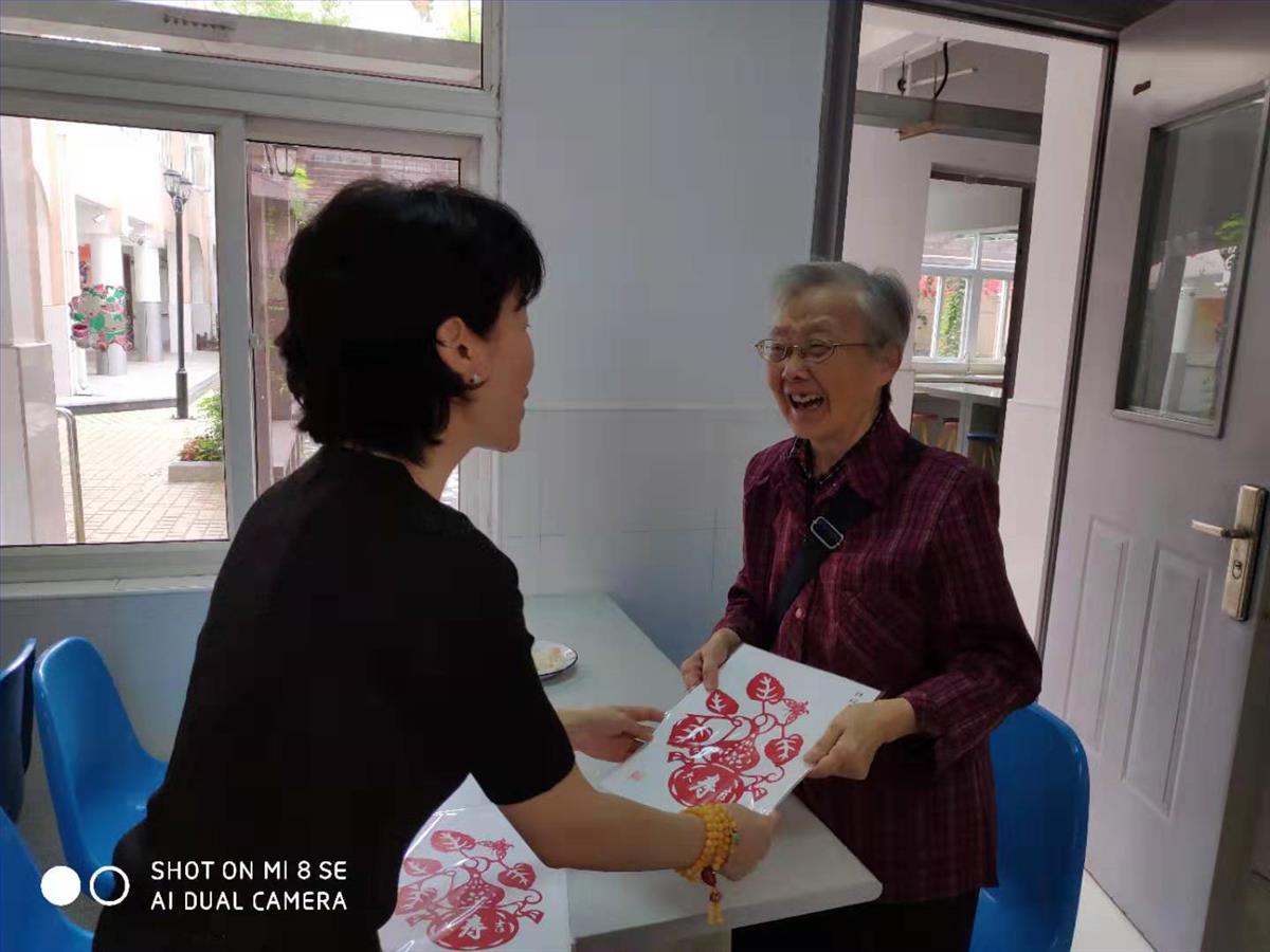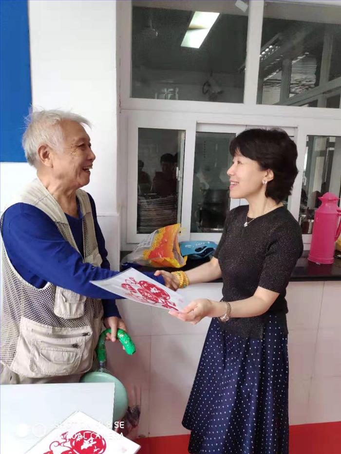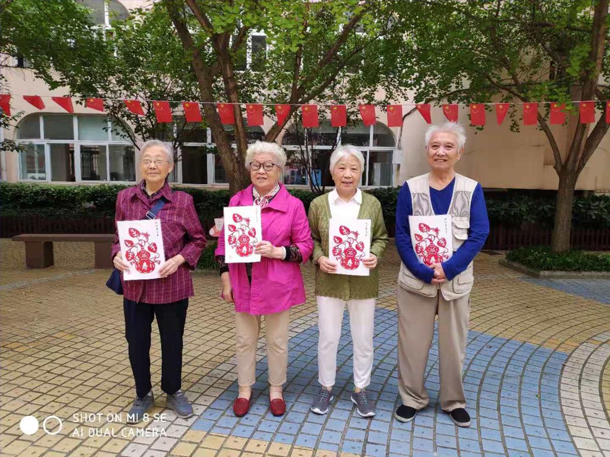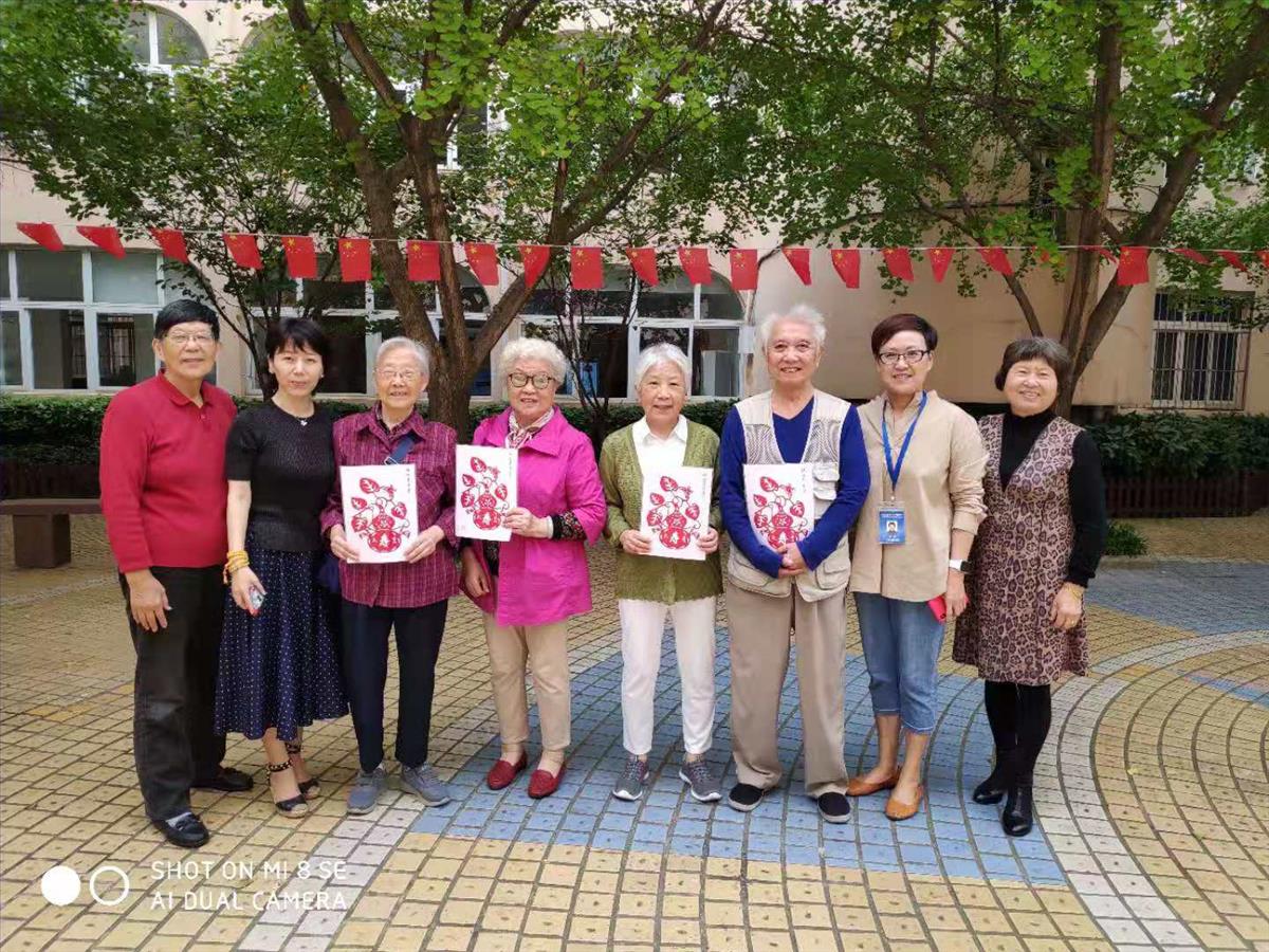 最后学校退休教工“一纸一世界”剪纸社团为80岁以上老人送上了“祝福寿康宁”的剪纸礼品并合影留念。