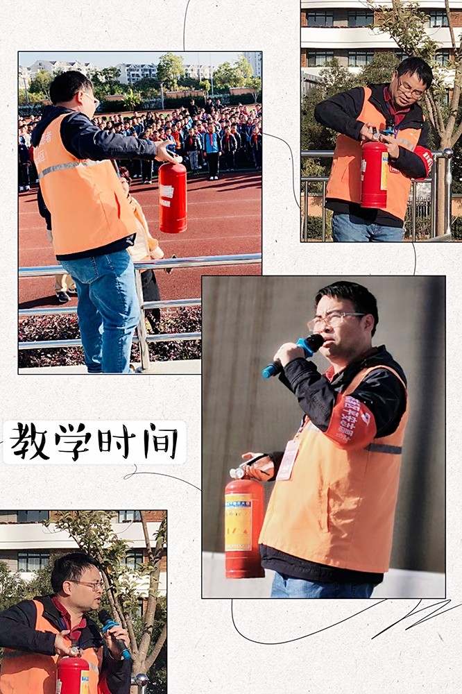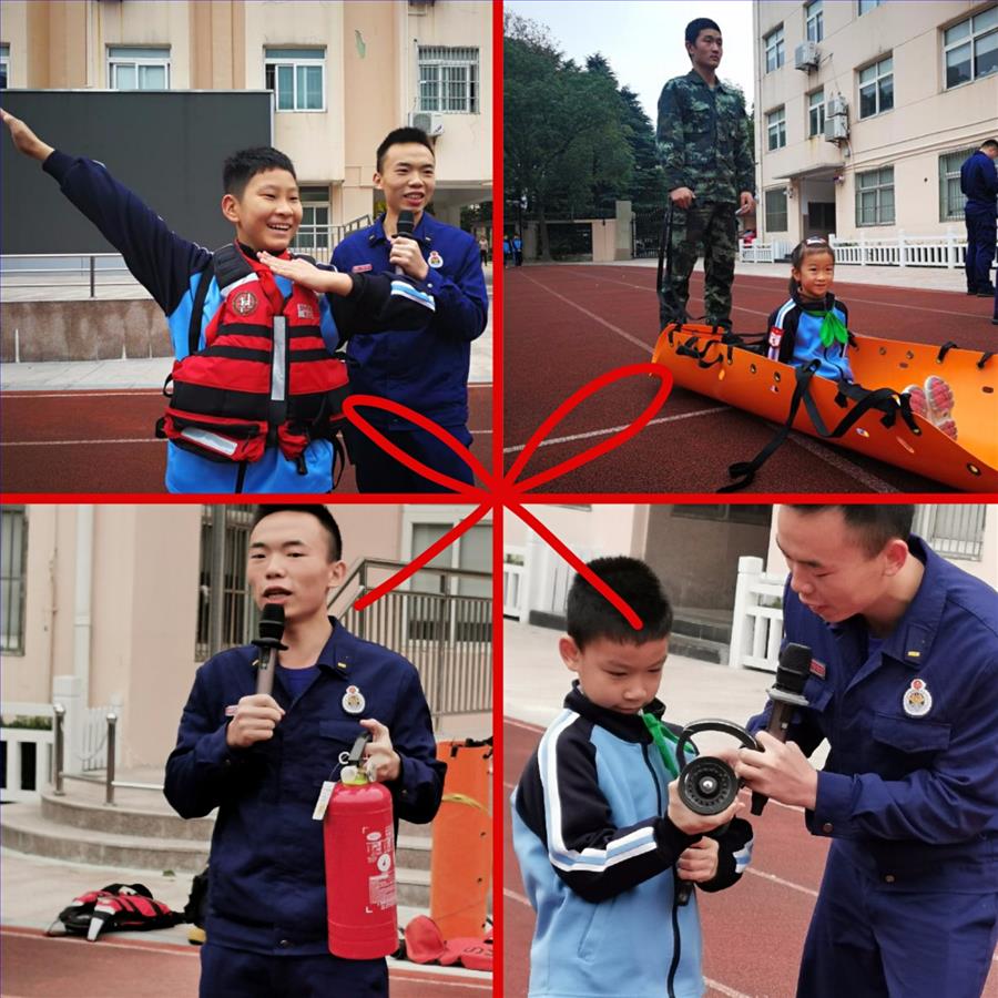 演习结束以后,蓝村校区消防员叔叔还给学生们介绍了消防员逃生小知识,演示了消防员如何快速穿消防衣,介绍了消防水龙头和灭火器的使用;懿德校区的陆老师与与计老师“全副武装”,向全校师生示范如何正确使用灭火器。