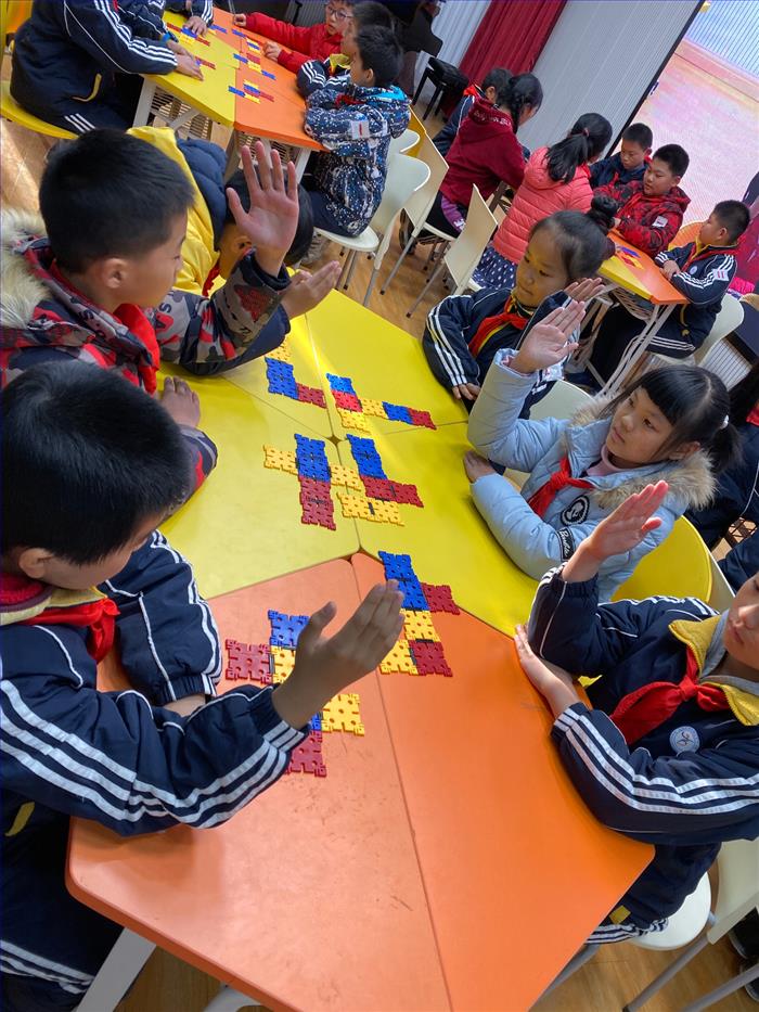首先,由奚育青老师为大家带来了一堂数学拓展课《骰子密码——相对的面》。奚老师先是让学生们回顾了正方体的11种展开图。接着,由一个相对面同色的正方体引出探究内容。之后学生们在老师的引导下,通过动手调整1-4-1型的彩片位置,实现相对面同色,在此过程中发现彩片的排列特点,并尝试运用数学语言进行总结归纳。之后又在1-3-2、2-2-2及3-3中进一步验证并完善所得到规律性的认识。整堂课以小组为单位开展活动及评价,学生参与度高,课堂气氛融洽。