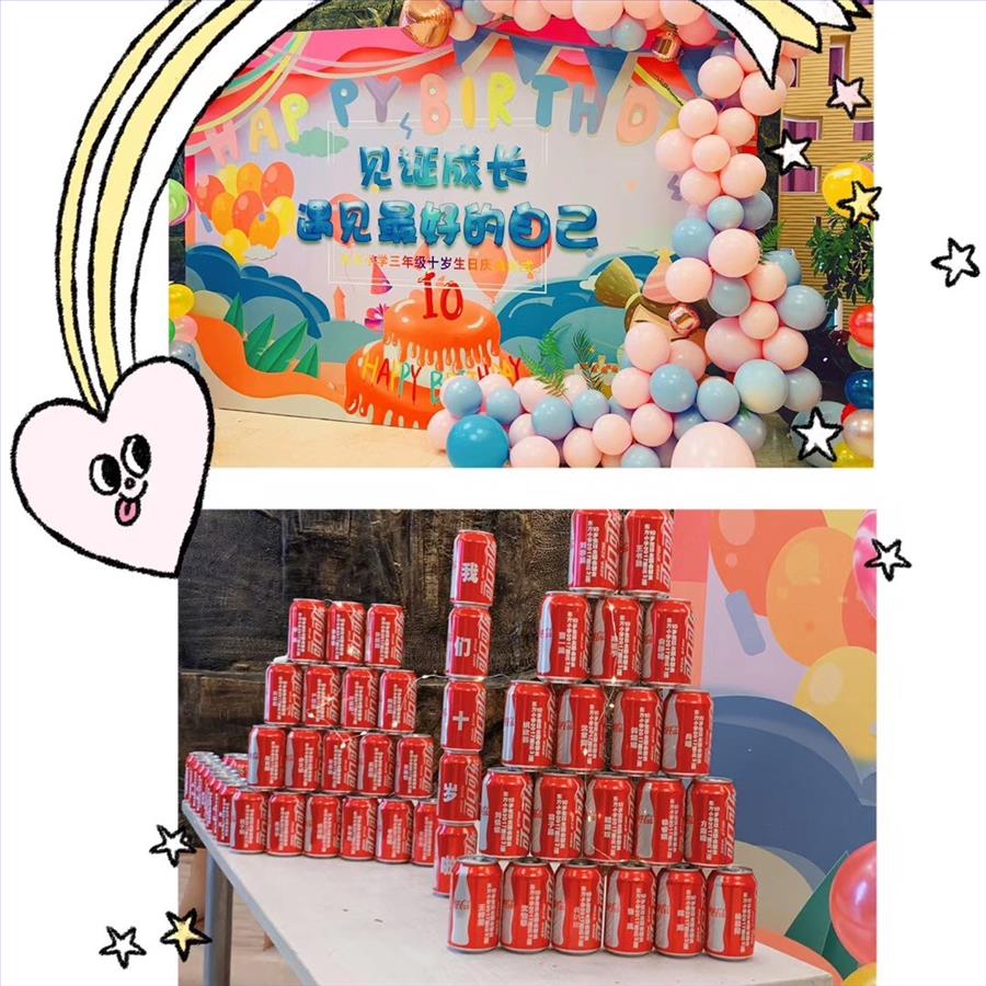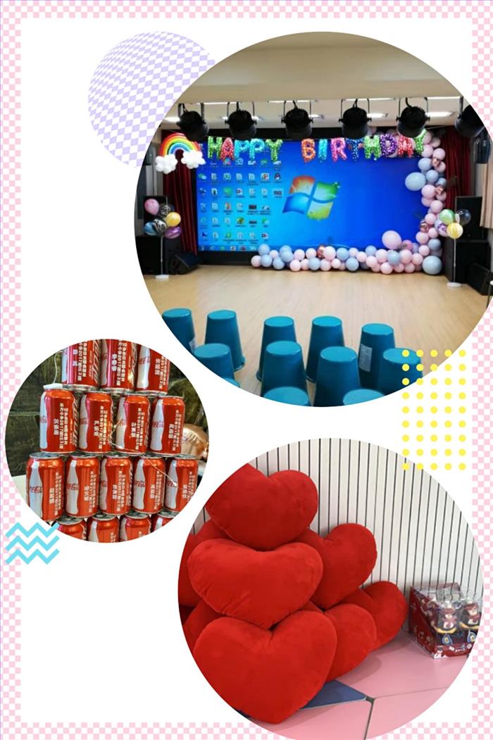 一早,家长志愿者们纷纷来到会场进行布置。在他们的巧手下,会场处处洋溢着生日会的喜气。