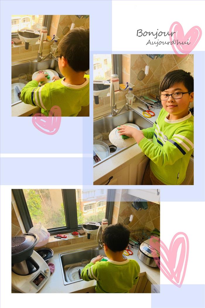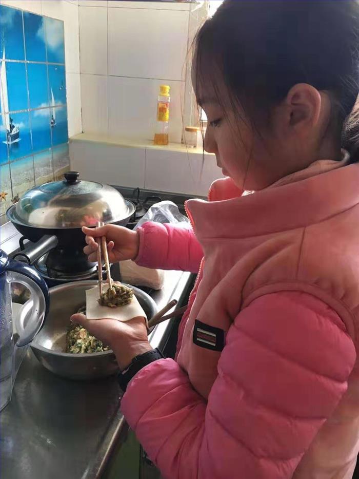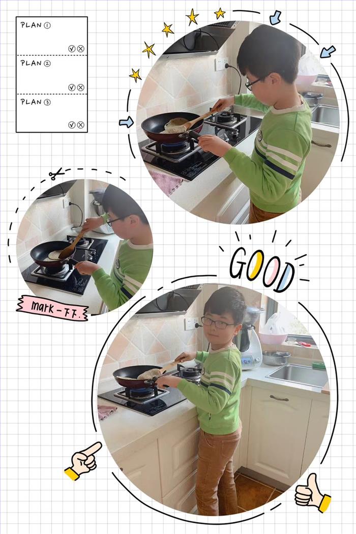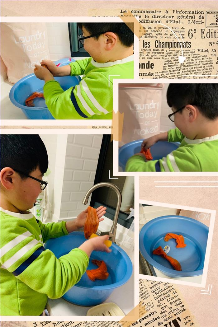 蓝村校区三3中队严恺瑜同学利用空闲时间和妈妈学做饭,洗袜子同时在电视看到疫情后,还捐出自己的压岁钱。