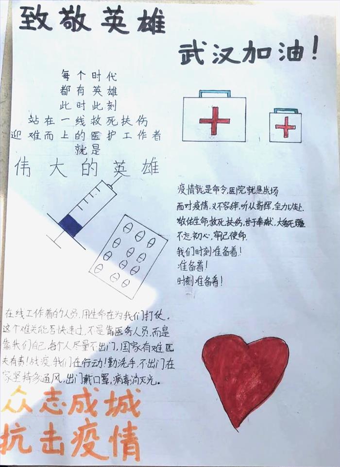 这是一个不同寻常的春节,全国人民上下一心,众志成城,共抗疫情。东方小学的少先队员们也纷纷响应,共同学习防疫知识,礼赞先锋榜样,传播社会正能量:争当防疫“小卫士”,学会用正确的方法保护自己;做好防疫“小宣传员”,学会自己思考和分析,在家中与家人一起通过正确的渠道学习了解相关新闻信息;践行“学先锋,做先锋”的精神,用一段视频向一线医务工作者致敬,编一首歌谣牢记防护小常识,画一张小报传递正能量。
