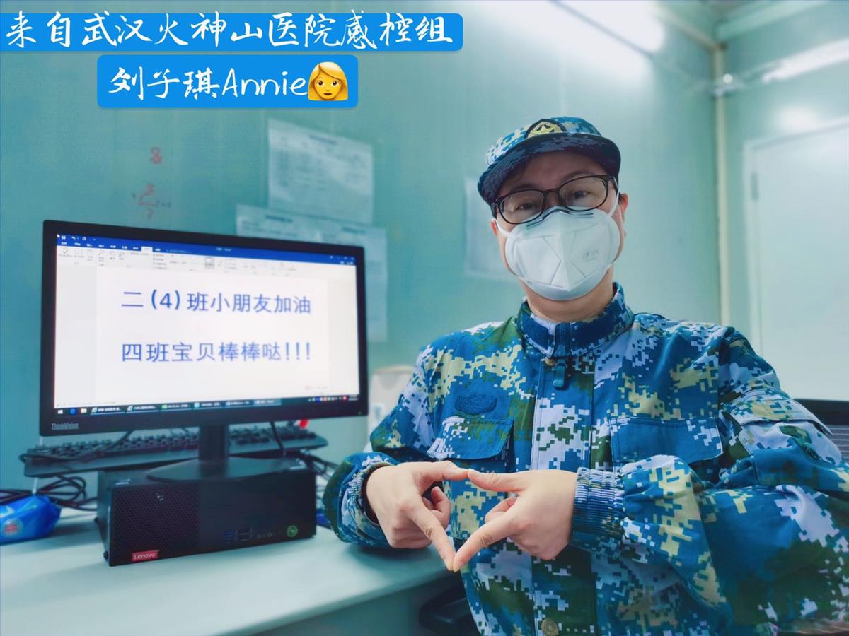 而班级中刘子琪同学的妈妈是一位白衣天使,在大年三十的晚上义不容辞地成为了第一批支援武汉的逆行者,至今依然奋斗抗战在救死扶伤、安全保卫的第一线,用“舍”和“守”撑起百姓的安康。