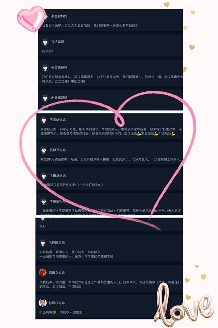 周皓轩妈妈用自己的实际行动给孩子树立了榜样,起到了示范引领的作用。她还联系班主任杨老师,组织二(4)班每一位小朋友,参与爱心捐赠,每人捐赠1元。让孩子们感同身受接受一场爱的教育,学会去帮助,向医护人员表达敬意,同时也让孩子们看到每个人都付出一点爱,汇集在一起就可以成为一股强大的力量,能去做更多的事,能帮助更多的人。在孩子们心里种下一颗善良爱心的种子,以后在老师的教导下生根发芽更加的壮大!