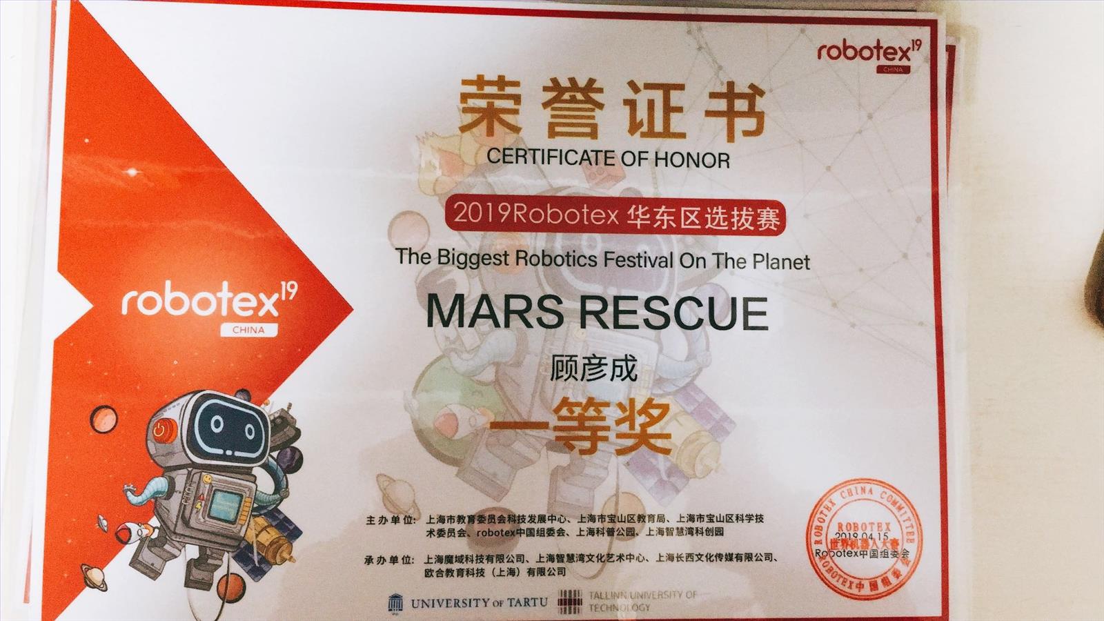 Robotex是欧洲最大的机器人竞赛,由爱沙尼亚塔尔图大学、塔林理工大学两所世界知名院校联合发起,共同支持协办。经过17年的发展与成长,现已经成为小学、初中、高中、大学、创客空间、机器人俱乐部都在参与的世界级机器人盛会。每年都能吸引来自30多个国家的3000多支队伍同台竞技,争夺冠军宝座。今年的大赛首次设立中国分赛区,分别在上海、武汉、大连、杭州、银川5个城市进行选拔赛,共设立乐高WeDo、城市穿越、乐高相朴、循线、越野拉力、头脑风暴-智慧搭建、火星救援-创客挑战赛等7个项目。学校的四名学生参加的是火星救援-创客挑战赛。