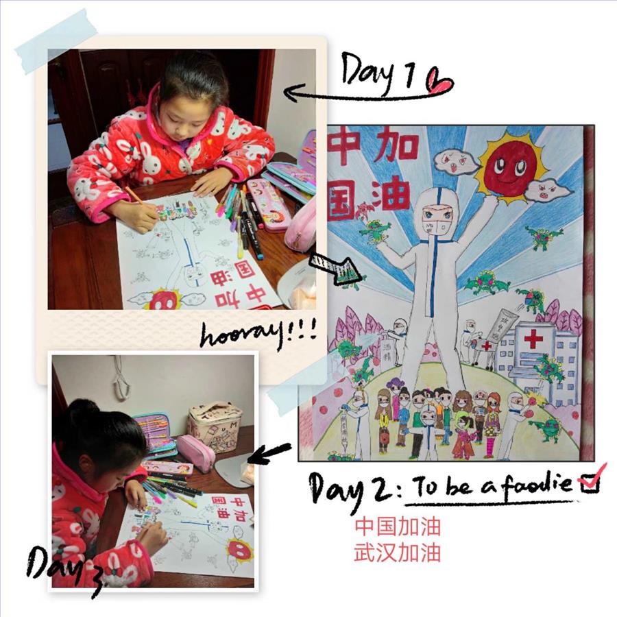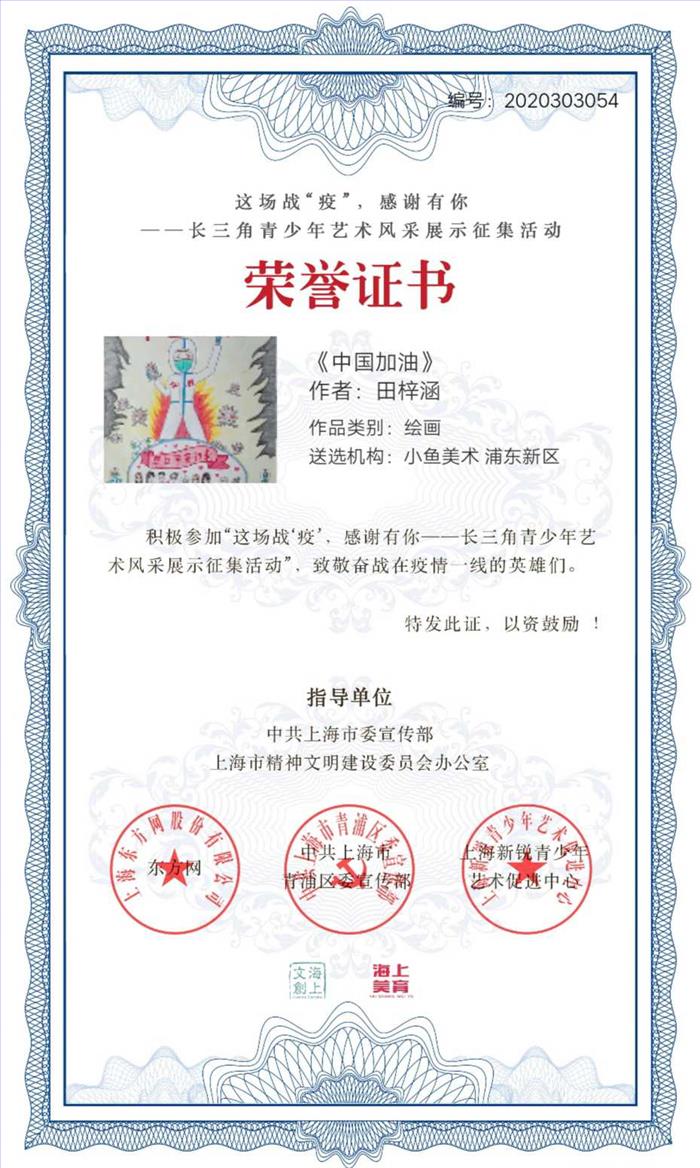 除了日常的学习之外,田梓涵始终关心着疫情并且用自己的方式为一线“逆行者”加油。她平时喜爱绘画,在不懈努力下,已经考出了漫画九级资质。田梓涵的奶奶是一名幼教工作者,她深知居家学习的这段时间也是教育的契机,她鼓励田梓涵关注疫情,关心那些抗疫英雄。因此,田梓涵在抗疫期间,她参加了“上海市和武汉市中小学生防控传染病手抄报征集活动”,呼吁大家拒食野生动物;她的作品还作为优秀画作刊登在了网站上。她的漫画《中国加油》还参加了“这场战‘疫’,感谢有你”的长三角青少年艺术风采展示征集活动,获得了荣誉证书。