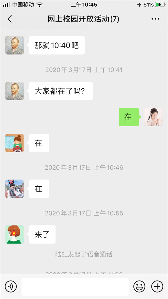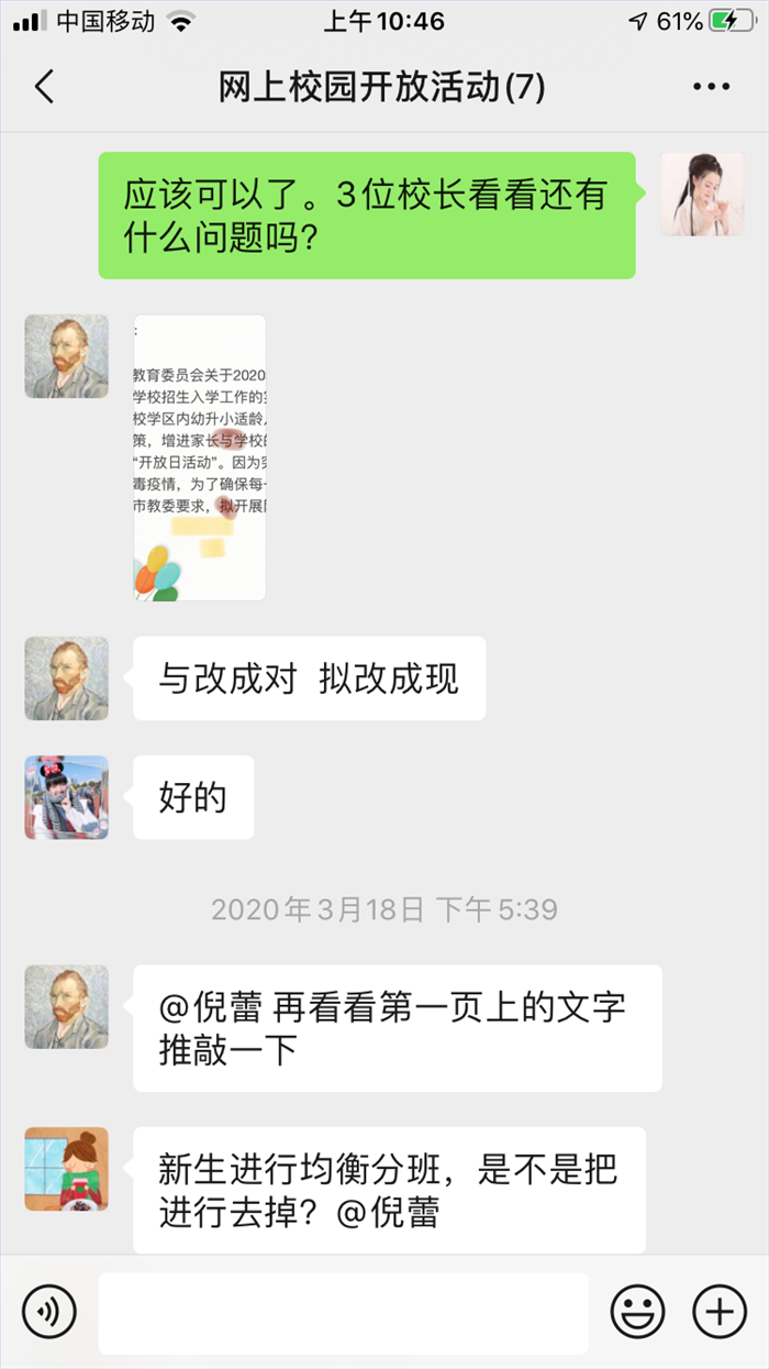 因为是首次网上校园开放,校方非常重视。陆校长第一时间组建了“网上校园开放日工作小组”微信群,两位副校长、教务处主任、招生负责老师、信息科技技术负责老师纷纷入群,就网上校园开放进行了微信语音会议。1个多小时的讨论,就开放内容、分工准备、时间节点一一落实。仅一天的时间,网上校园的开放内容基本落实。为了加强宣传,工作组还设计了“网上校园开放邀请函”,老师们对于文字内容、排版,进行了反复修改,力求做到规范、清晰。一切就绪,但仍有些不放心,在开放日活动开始之前,再次对于开放内容的文字表述、图片规格进行检查,负责网站建设的徐老师还和负责网上咨询回复的老师进行了模拟的提问和回复,确保“咨询”板块的正常运行。