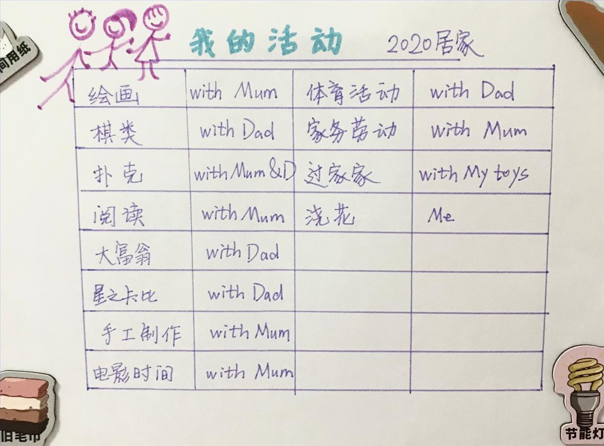 疫情期间,爸爸在家办公,妈妈照顾饮食起居,孩子参加空中课堂并严格按照课表时间上课。因为课间时间长,在下一节课上课前,方便时,我们也会陪同孩子读诗词、绘本和练字。放学后的时间里,我们的家庭活动也按计划安排起来,大部分是亲子活动,包括益智的、游戏的和居家劳动的。
