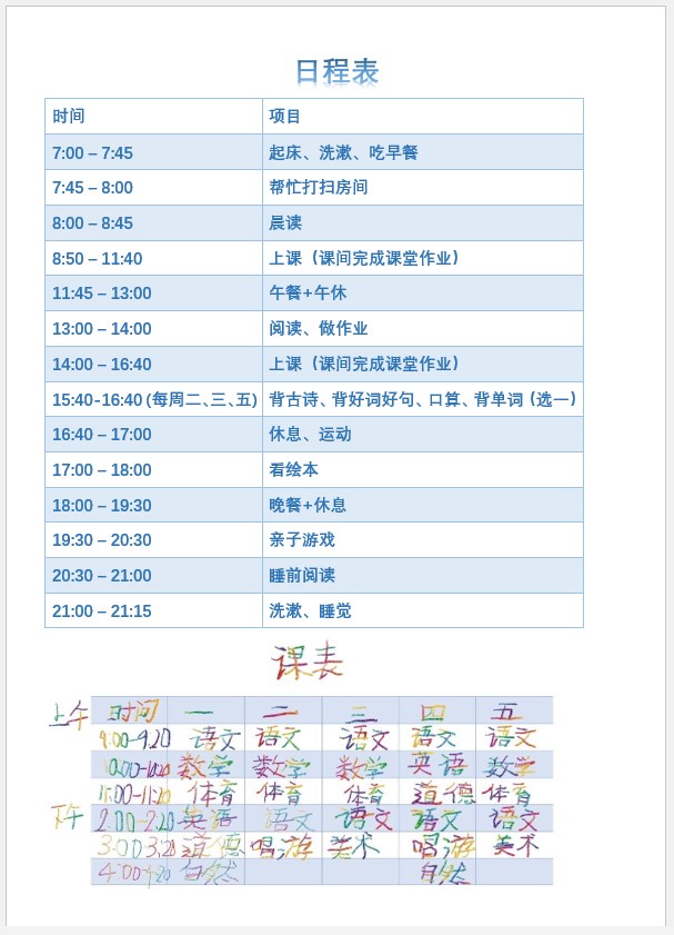 疫情好转后,我们接到了轮岗、错峰上班的通知。我们不得不改变策略,如何激发孩子内在的动力,自主学习,合理分配时间和简单的生活自理成了当务之急。首先,我们在家安装了可通话的摄像头,孩子起初对摄像头还是比较抵触的,我就会向他介绍摄像头的新进功能,比如可以转向,可以通话等功能,我认真耐心地解释,装摄像头不是为了监视他,让他觉得这是为了安全考虑,而且这只是方便我们联络的工具。其次,让我担心的就是他到底会不会自己使用电脑,准时进入课堂,并且及时上交作业。我和孩子一起制作了一张课程表,让他清楚了解学习内容和我对他的要求,同时也教会他如何使用电脑、如何进入课堂。之后,我就放手一搏,我选择完全相信他能自主学习,能做到我们在和不在一个样,当然,同时我也做好了班主任找我谈话的心理准备。
