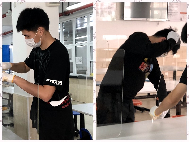 为了确保学生们有序、健康用餐,东方的校园食堂进行全面升级,并制定了周密的用餐制度,确保同学们分班、分区、同向、间隔就餐。为此,学校订购了大量隔板安装在食堂餐桌上,用于将就餐学生分隔开来,确保用餐安全。