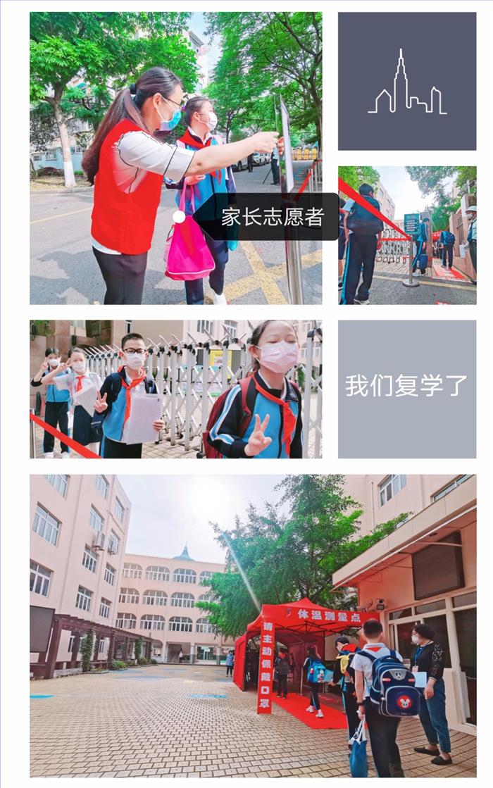 四五年级的同学们戴着口罩,错峰进校,井然有序,保持一米以上距离,人流疏散不聚集。校门口除了护导老师外,还有志愿者家长的身影,她们与老师们一同引导学生,维持秩序。