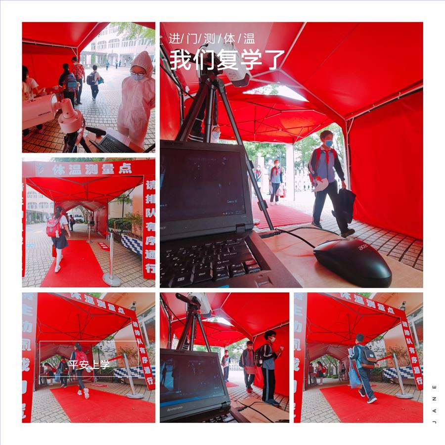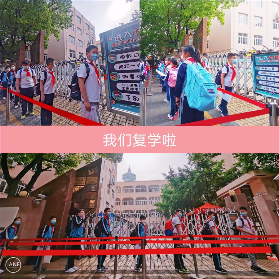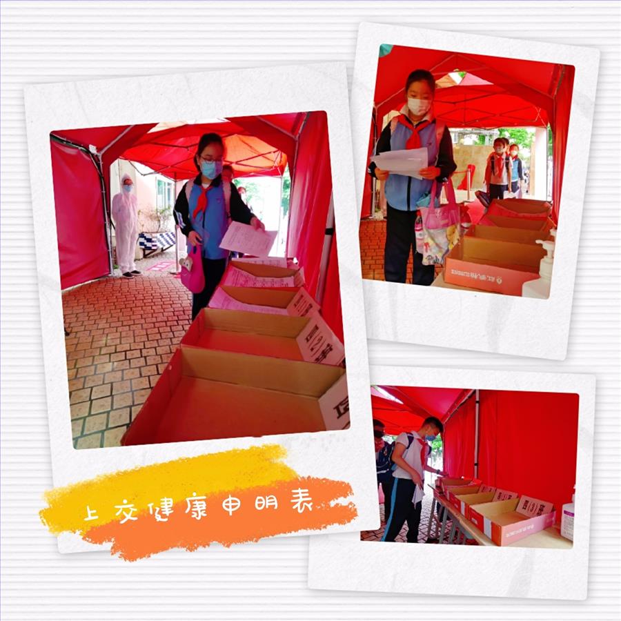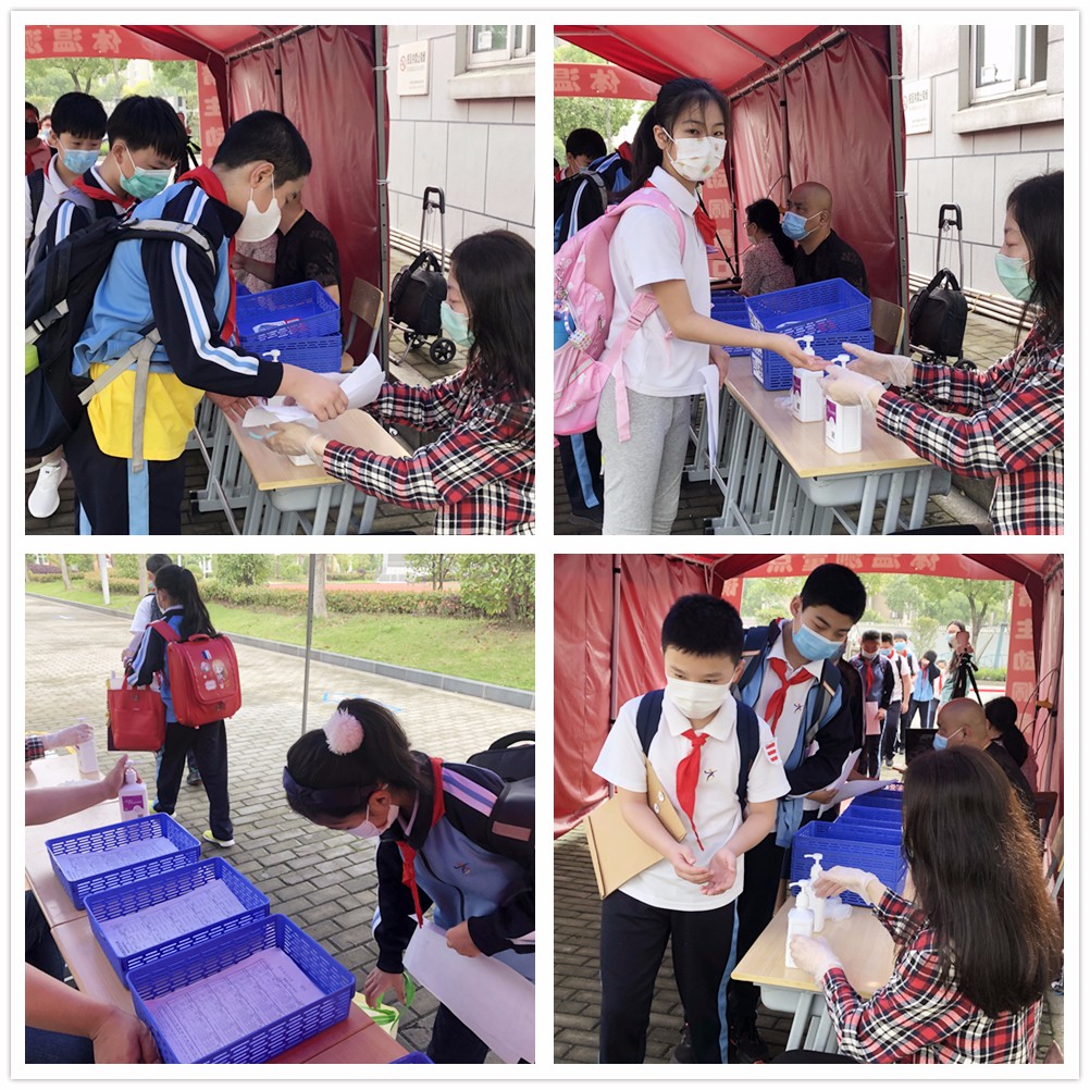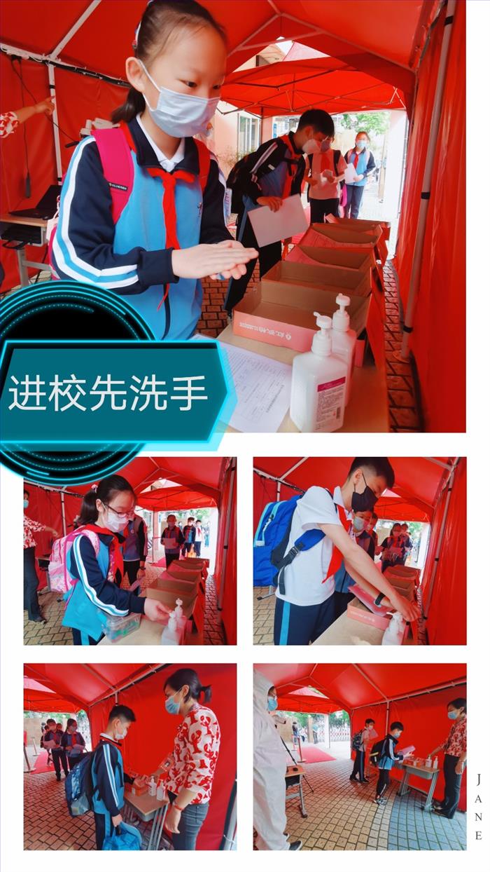 入校后,同学们通过红外线热成像感应仪,进入校门。上交《健康申明表》之后,进行洗手消毒。虽然返校激动的心情溢于言表,但是云升旗、云队会的防疫安全教育仍牢记心上,大家自觉站在一米线等候。