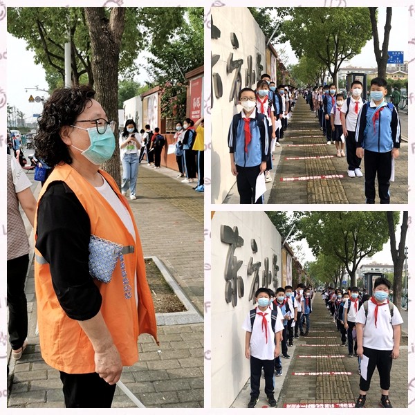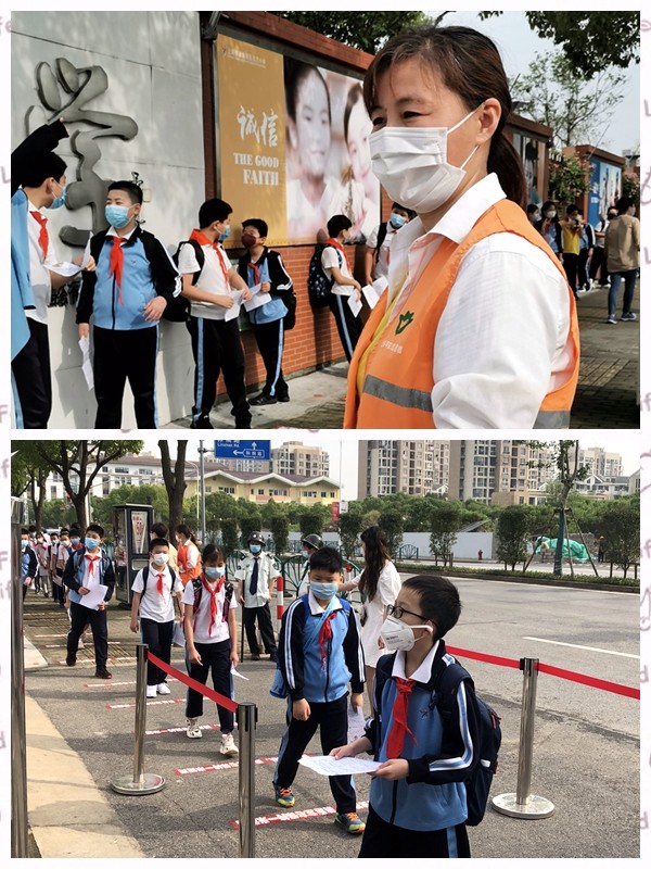 在复学第一周的东方小学校门口,家长志愿者们主动承担起了在校门口提醒学生相隔一米以上有序进校。