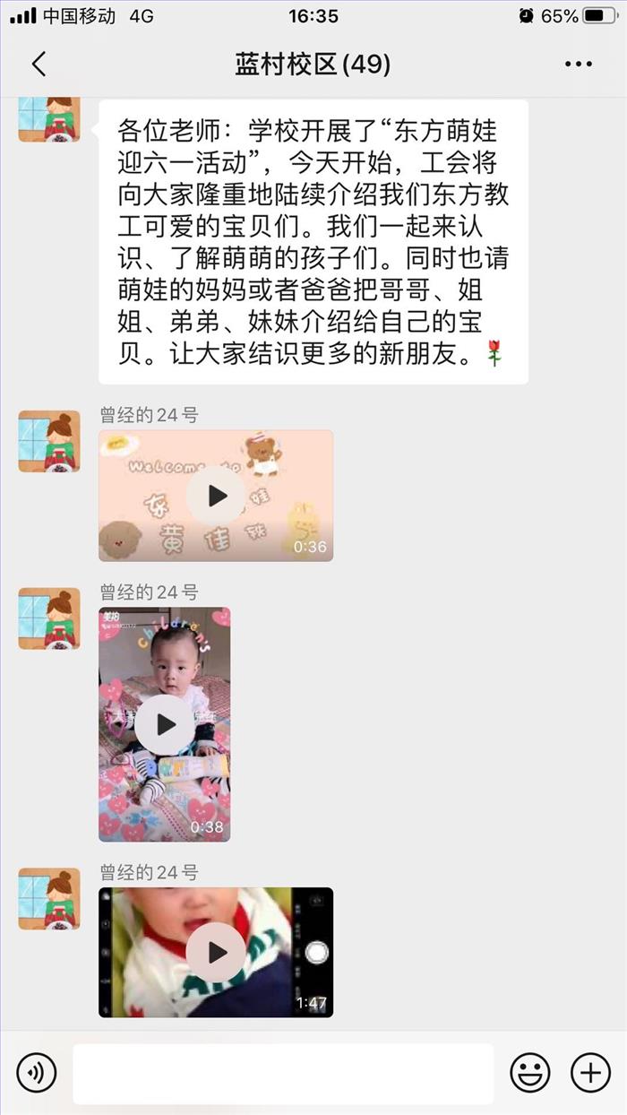 2、由于疫情的原因,今年的“六一节”不能开展实际亲子的活动,但是学校工会推出了线上活动——借助微信平台开展“东方萌娃迎六一”活动:即爸爸(妈妈)在东方小学工作,本人是五年级(含五年级)的萌娃们参与这次活动,向大家介绍自己,并送上六一祝福等。组内的老师们接到活动任务后,在紧张的工作之余,精心的准备、构思,反复的排练,认真地拍摄,仔细地制作,最终一个个可爱的东方萌娃们呈现在我们面前,让我们感受到了萌娃们传递的一份份祝福和快乐的氛围。