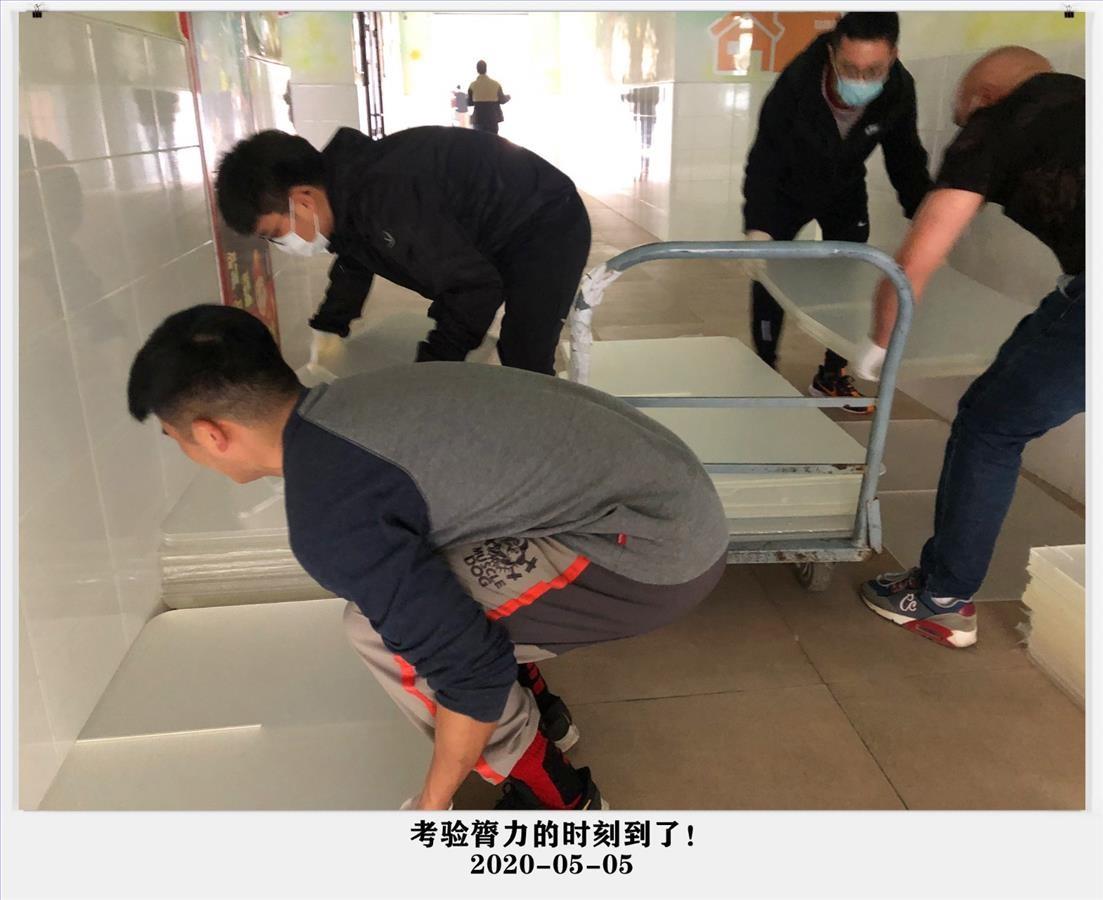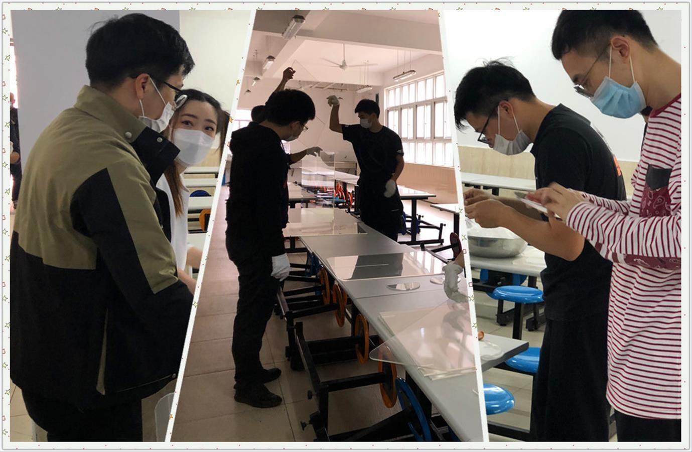 复学前,为了确保学生们有序、健康用餐,东方的校园食堂进行全面升级,并制定了周密的用餐制度,确保同学们分班、分区、同向、间隔就餐。为此,学校订购了大量隔板安装在食堂餐桌上,用于将就餐学生分隔开来,确保用餐安全。从搬运、撕膜到组装,我们工会的几名男老师亲力亲为地参与了安装工作。老师们分工完成每一道工序。几百块隔板每一块都需要老师细致地剥开正反两面的贴膜;沉重的隔板在组装过程中需要老师们搬来运去,有时甚至需要数名老师合力搬运;还有老师负责最后的组装。