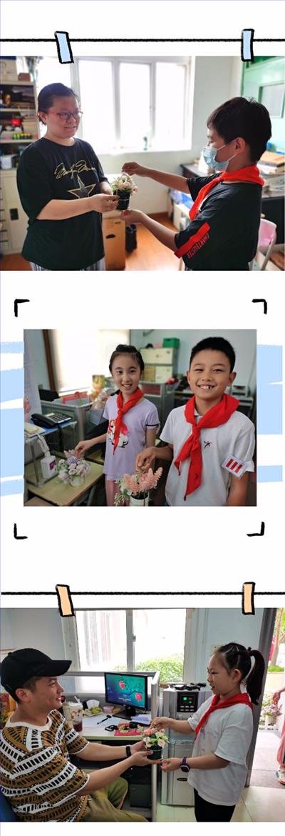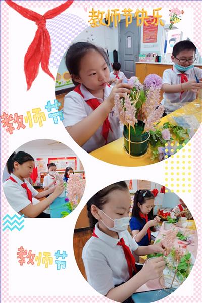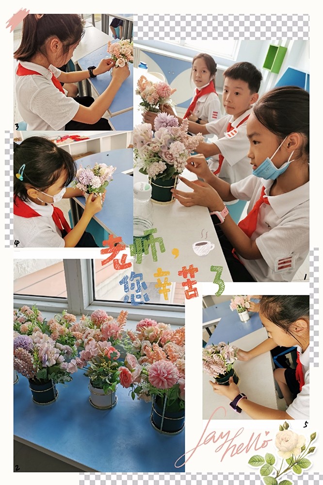 其实早在开学第一周,大队委员们就精心准备了教师节礼物。为了让老师们收到队员们的心意,他们每天中午在队室内用自己的双手制作着充满着自己感激之情的花艺盆栽。