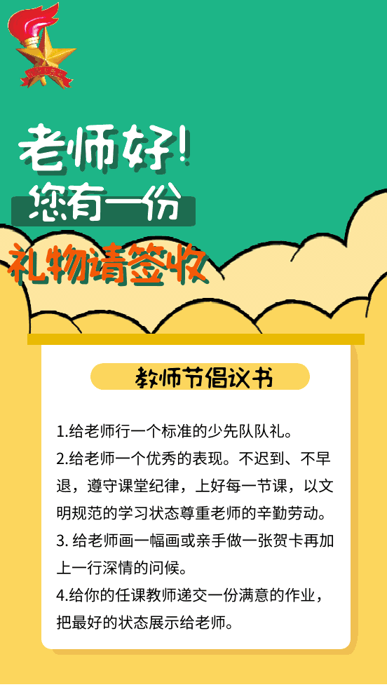 9月7日的升旗仪式上,大队委员向队员们宣读了教师节倡议书!并展示了自己的礼物!
