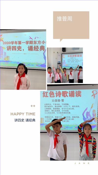 普通话是神州音符,传递着华夏儿女的深情,汉字是祖国瑰宝,流动着华夏儿女的智慧。学校是推广普通话,推行规范汉字的重要阵地,东方小学扎实做好第23届推普周的宣传工作,认真开展了一系列丰富多彩的推普周的活动。