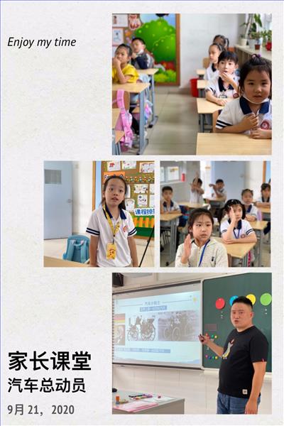 课程分为“互动游戏”“汽车小贴士”“分组活动”“有奖问答”四个环节。在“汽车小贴士”环节中同学们通过看视频,听讲解知道了世界上第一辆汽车的诞生、汽车的发展和演变等知识。同学们还对未来汽车的发展进行了畅想。
