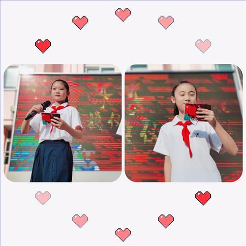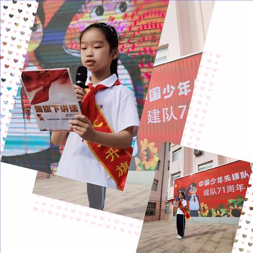 8:20分,主题升旗仪式准时开始!队员们注目着鲜艳的五星红旗,在嘹亮的国歌声中,向国旗敬礼。光荣升旗手带领全体队员共同回顾关于红领巾的光阴故事。随后,来自三(3)中队的11名队员献上他们对建队日的贺礼,少年梦,中国梦,红领巾和祖国共成长,队员们高唱《红领巾中国梦》并用朗诵说出了自己的心声,鲜艳的红领巾飘扬在每一个人胸前。