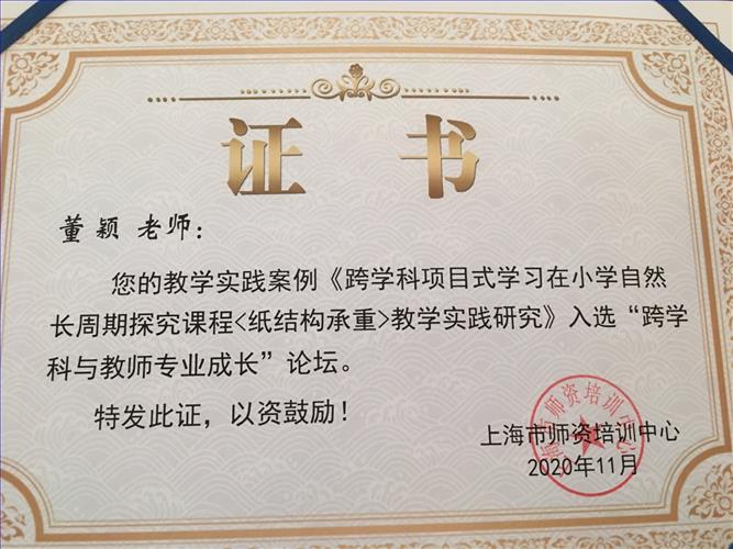 东方小学教师们积极参加本年度跨学科项目学习的论文比赛。功夫不负有心人,最终董颖老师的参赛案例《跨学科项目式学习在小学自然长周期探究课程<纸结构承重>教学实践探究》入选“跨学科与教师专业成长”论坛。