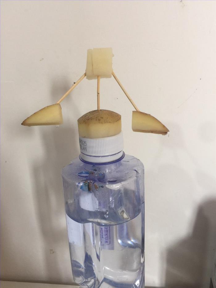 四、五年级的挑战项目是:科学小实验——站立的土豆。要求用土豆块和牙签做成一个不倒翁,让它站立在矿泉水瓶上或者站立在另一根牙签上。这同样是一个关于重心的小实验,两侧的土豆块降低了重心位置,使不倒翁站得稳稳的。通过动手实验同学们有了很多发现:两侧的土豆块大一点、重一点稳定性更好;不倒翁的材料还可以用胡萝卜、橡皮等来制作;为了增加稳定性不仅在两侧还可以在四周都加上土豆块……