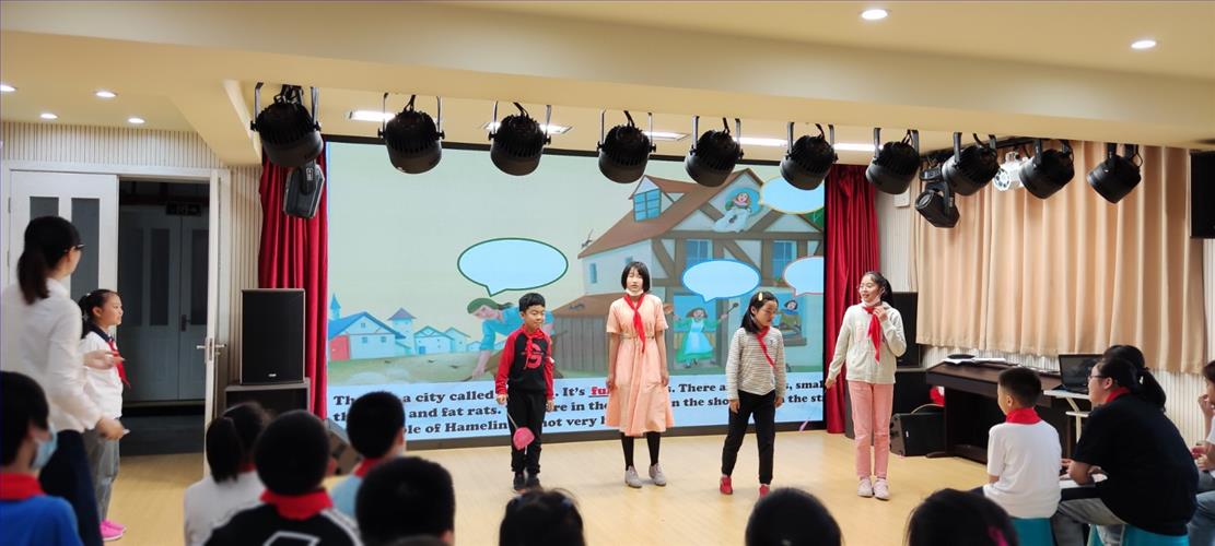 2021年5月19日下午,东方小学蓝村校区五楼小剧场开展了“国际化戏剧课程项目工作坊”活动。首先由东方小学英语戏剧社团的师生带来一堂主题为The Piper of Hamelin的展示课。英语戏剧社团学生来自本校三至五年级不同班级,共20位,他们语言能力、性格特点各有不同,但学生们在分组活动中,逐步融合,相互合作,在社团活动中培养和发展了交流和解决问题的能力。秦老师通过role on the wall、role play、conscience alley等戏剧方法让学生感受人物形象,同时引导学生通过对话朗读、看图说话、台词创编等形式读懂语篇,尝试话题表达。