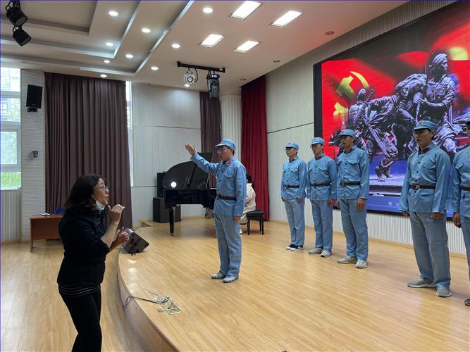 学生处主任史老师用她专业的声乐技巧,丰富的经验,耐心地指导着大家……在认真努力的氛围下,男老师们很快掌握了歌曲的合唱技巧。