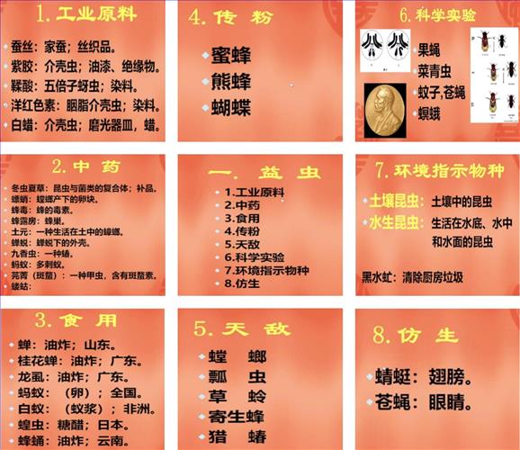 今天下午第二节课,我们看了科学讲座--昆虫与人类,这使我们更了解大自然、贴进大自然。殷教授给我们带来了许多昆虫知识,比如:昆虫的特点、昆虫的历史、昆虫的种类等等。通过次学习我也收获了许多课外的昆虫知识,让我给大家讲一讲我印象最深刻的知识--益虫的价值。益虫有价值的地方:1、“工业原料”比如蚕的蚕丝等;2、“中药”许多昆虫也有药用价值,如土元、九融等。3、“食用”可以用的昆虫有蚁、蚕、蝉等;4、“传粉”昆虫传粉可以促进花的传播,能传粉的昆虫有蜜蜂、熊蜂、蝴蝶等。