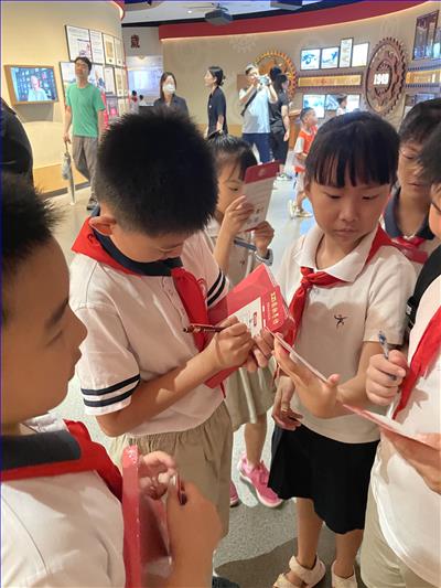 2023年7月29日下午,蓝村校区四(2)中队青禾小队的队员们怀着好奇和求知的心情来到位于杨浦区荆州路151号的国歌展示馆,追寻着红色足迹,去了解我们耳熟能详的国歌究竟是怎样诞生的。在正式参观前,每位队员都领取了一份来展馆工作人员精心准备的纪念品以及“2023国歌寻访”国歌知识问答任务单,大家在小小讲解员的带领下,开始了此次寻访之旅。
